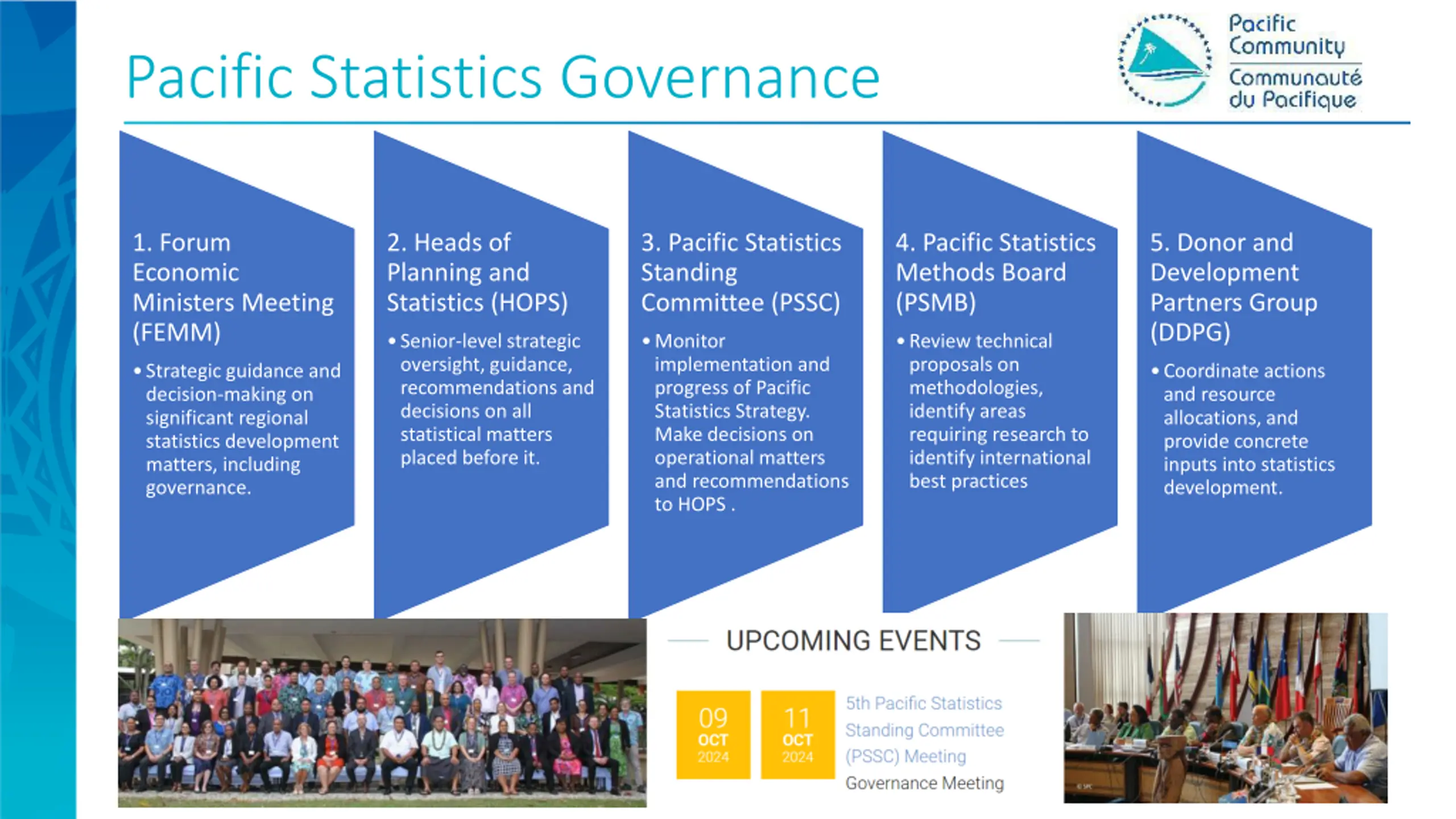 Pacific Statistics Governance 1. Forum Economic Ministers Meeting (FEMM) 2. Heads of Planning and Statistics (HOPS) 3. Pacific Statistics Standing Committee (PSSC) 4. Pacific Statistics Methods Board (PSMB) 5. Donor and Development Partners Group (DDPG) Senior-level strategic oversight, guidance, recommendations and decisions on all statistical matters placed before it. Monitor implementation and progress of Pacific Statistics Strategy. Make decisions on operational matters and recommendations to HOPS . Review technical proposals on methodologies, identify areas requiring research to identify international best practices Strategic guidance and decision-making on significant regional statistics development matters, including governance. Coordinate actions and resource allocations, and provide concrete inputs into statistics development.
