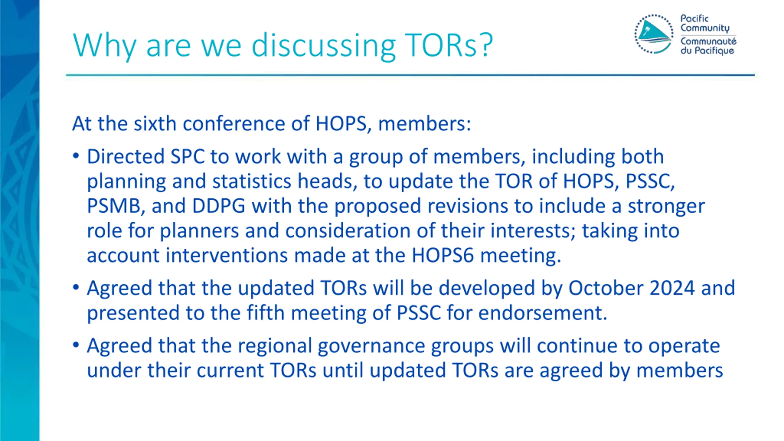 Why are we discussing TORs? At the sixth conference of HOPS, members: Directed SPC to work with a group of members, including both planning and statistics heads, to update the TOR of HOPS, PSSC, PSMB, and DDPG with the proposed revisions to include a stronger role for planners and consideration of their interests; taking into account interventions made at the HOPS6 meeting. Agreed that the updated TORs will be developed by October 2024 and presented to the fifth meeting of PSSC for endorsement. Agreed that the regional governance groups will continue to operate under their current TORs until updated TORs are agreed by members
