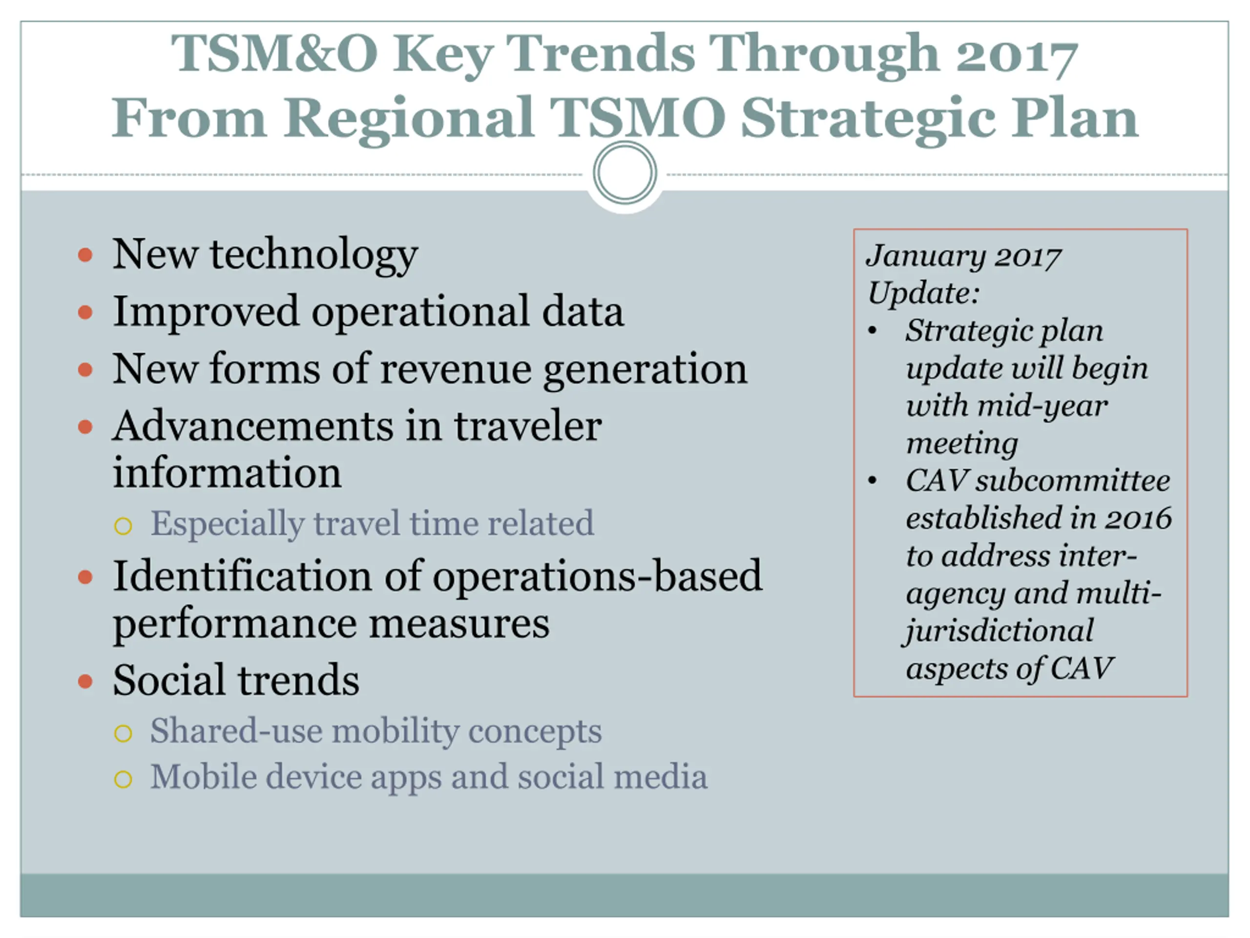 TSM&O Key Trends Through 2017 From Regional TSMO Strategic Plan New technology Improved operational data New forms of revenue generation Advancements in traveler information Especially travel time related Identification of operations-based performance measures Social trends Shared-use mobility concepts Mobile device apps and social media January 2017 Update: Strategic plan update will begin with mid-year meeting CAV subcommittee established in 2016 to address inter- agency and multi- jurisdictional aspects of CAV