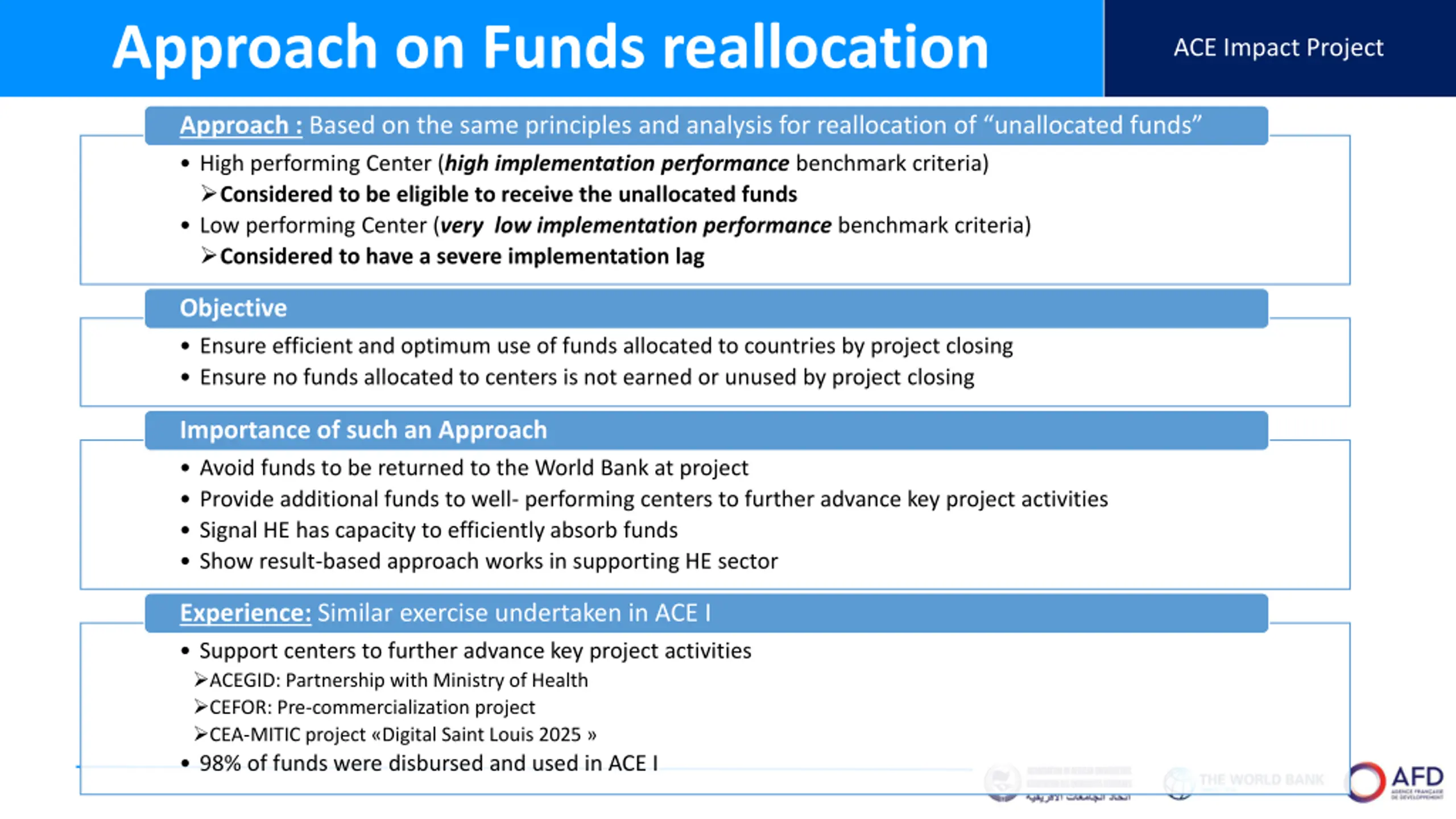 ACE Impact Project Approach on Funds reallocation ACE Impact Project Approach : Based on the same principles and analysis for reallocation of unallocated funds High performing Center (high implementation performance benchmark criteria) Considered to be eligible to receive the unallocated funds Low performing Center (very low implementation performance benchmark criteria) Considered to have a severe implementation lag Objective Ensure efficient and optimum use of funds allocated to countries by project closing Ensure no funds allocated to centers is not earned or unused by project closing Importance of such an Approach Avoid funds to be returned to the World Bank at project Provide additional funds to well- performing centers to further advance key project activities Signal HE has capacity to efficiently absorb funds Show result-based approach works in supporting HE sector Experience: Similar exercise undertaken in ACE I Support centers to further advance key project activities ACEGID: Partnership with Ministry of Health CEFOR: Pre-commercialization project CEA-MITIC project Digital Saint Louis 2025 98% of funds were disbursed and used in ACE I