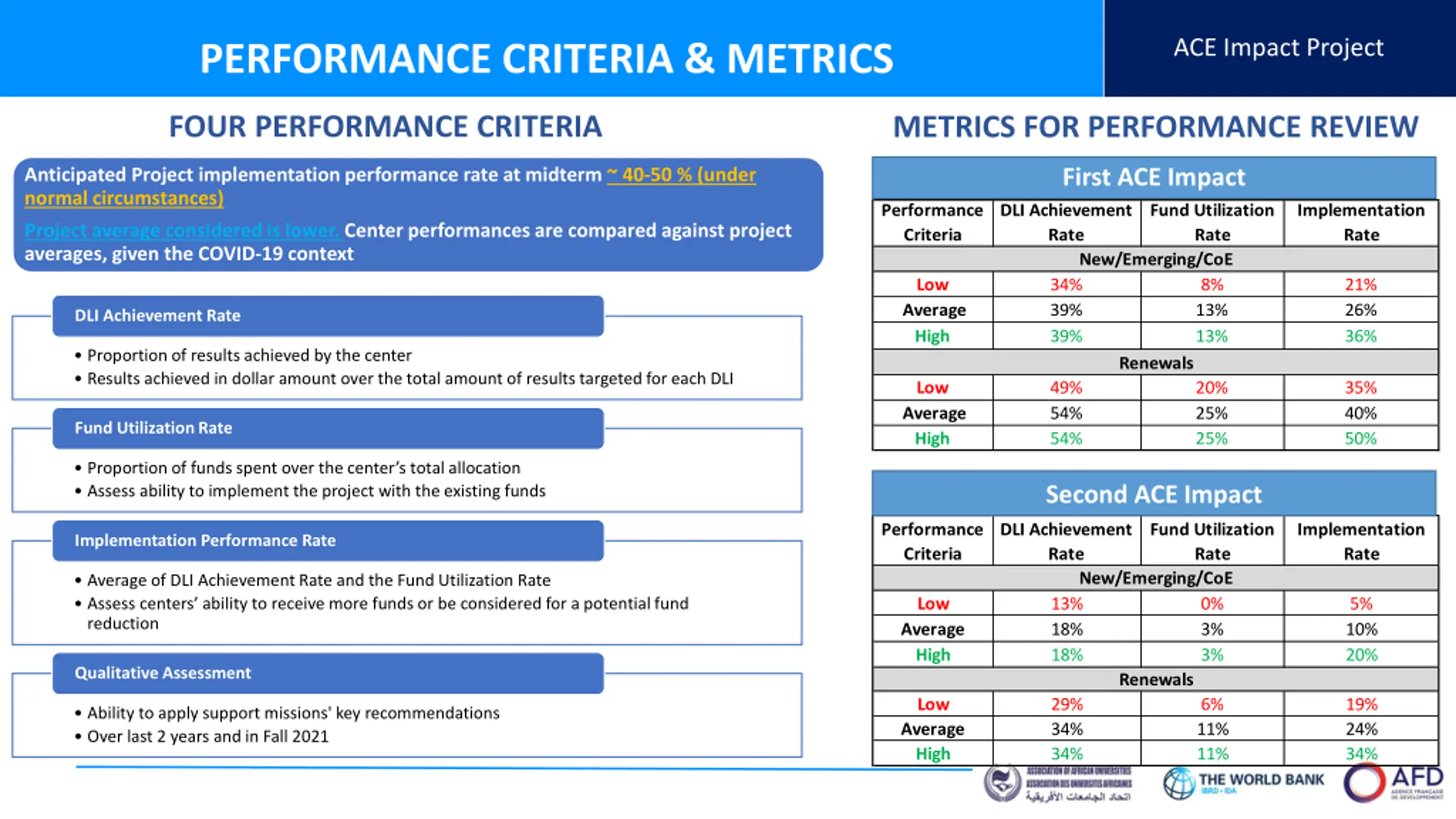 ACE Impact Project ACE Impact Project PERFORMANCE CRITERIA & METRICS FOUR PERFORMANCE CRITERIA METRICS FOR PERFORMANCE REVIEW First ACE Impact Anticipated Project implementation performance rate at midterm ~ 40-50 % (under normal circumstances) Performance Criteria DLI Achievement Rate Fund Utilization Rate Implementation Rate Project average considered is lower. Center performances are compared against project averages, given the COVID-19 context New/Emerging/CoE Low 34% 39% 39% 8% 13% 13% 21% 26% 36% Average High DLI Achievement Rate Proportion of results achieved by the center Results achieved in dollar amount over the total amount of results targeted for each DLI Renewals Low 49% 54% 54% 20% 25% 25% 35% 40% 50% Average High Fund Utilization Rate Proportion of funds spent over the center s total allocation Assess ability to implement the project with the existing funds Second ACE Impact Performance Criteria DLI Achievement Rate Fund Utilization Rate Implementation Rate Implementation Performance Rate New/Emerging/CoE Average of DLI Achievement Rate and the Fund Utilization Rate Assess centers ability to receive more funds or be considered for a potential fund reduction Low 13% 18% 18% 0% 3% 3% 5% 10% 20% Average High Qualitative Assessment Renewals Low 29% 34% 34% 6% 11% 11% 19% 24% 34% Ability to apply support missions' key recommendations Over last 2 years and in Fall 2021 Average High