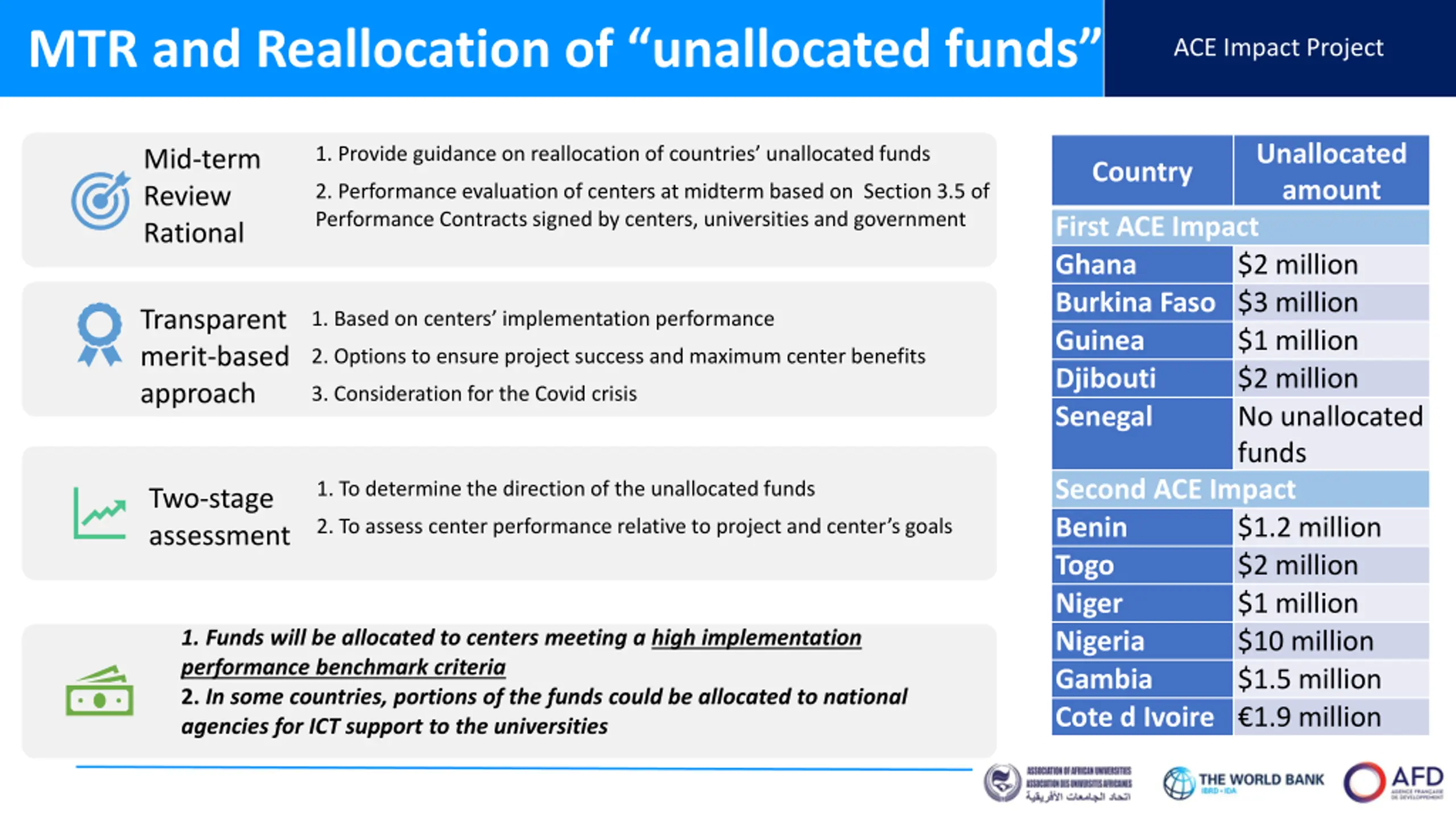 ACE Impact Project MTR and Reallocation of unallocated funds ACE Impact Project Unallocated amount 1. Provide guidance on reallocation of countries unallocated funds Mid-term Review Rational Country 2. Performance evaluation of centers at midterm based on Section 3.5 of Performance Contracts signed by centers, universities and government First ACE Impact Ghana Burkina Faso $3 million Guinea Djibouti Senegal $2 million Transparent merit-based approach 1. Based on centers implementation performance $1 million $2 million No unallocated funds 2. Options to ensure project success and maximum center benefits 3. Consideration for the Covid crisis Second ACE Impact Benin Togo Niger Nigeria Gambia Cote d Ivoire 1.9 million 1. To determine the direction of the unallocated funds Two-stage assessment $1.2 million $2 million $1 million $10 million $1.5 million 2. To assess center performance relative to project and center s goals 1. Funds will be allocated to centers meeting a high implementation performance benchmark criteria 2. In some countries, portions of the funds could be allocated to national agencies for ICT support to the universities