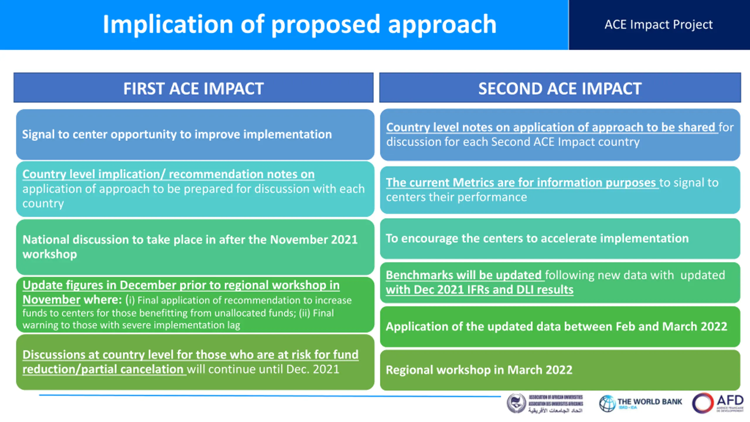 Implication of proposed approach ACE Impact Project ACE Impact Project FIRST ACE IMPACT SECOND ACE IMPACT Country level notes on application of approach to be shared for discussion for each Second ACE Impact country Signal to center opportunity to improve implementation Country level implication/ recommendation notes on application of approach to be prepared for discussion with each country The current Metrics are for information purposes to signal to centers their performance To encourage the centers to accelerate implementation National discussion to take place in after the November 2021 workshop Benchmarks will be updated following new data with updated with Dec 2021 IFRs and DLI results Update figures in December prior to regional workshop in November where: (i) Final application of recommendation to increase funds to centers for those benefitting from unallocated funds; (ii) Final warning to those with severe implementation lag Application of the updated data between Feb and March 2022 Discussions at country level for those who are at risk for fund reduction/partial cancelation will continue until Dec. 2021 Regional workshop in March 2022