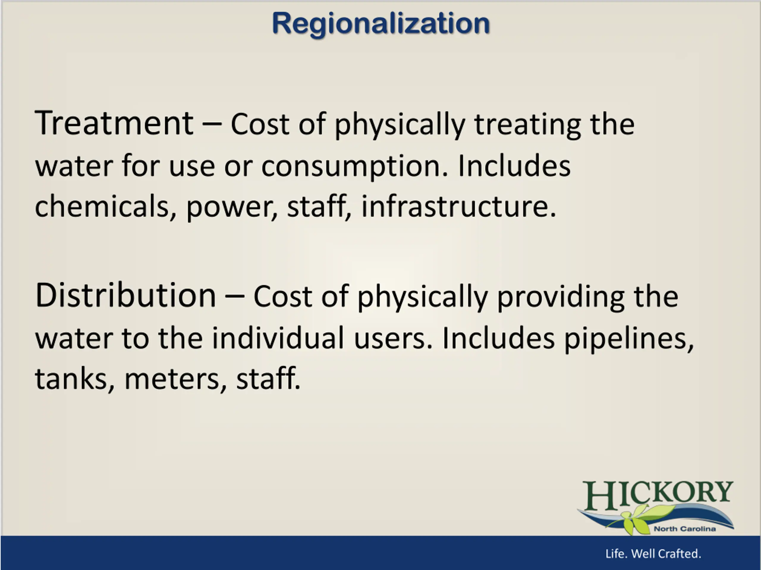 Regionalization Treatment Cost of physically treating the water for use or consumption. Includes chemicals, power, staff, infrastructure. Distribution Cost of physically providing the water to the individual users. Includes pipelines, tanks, meters, staff. Life. Well Crafted.