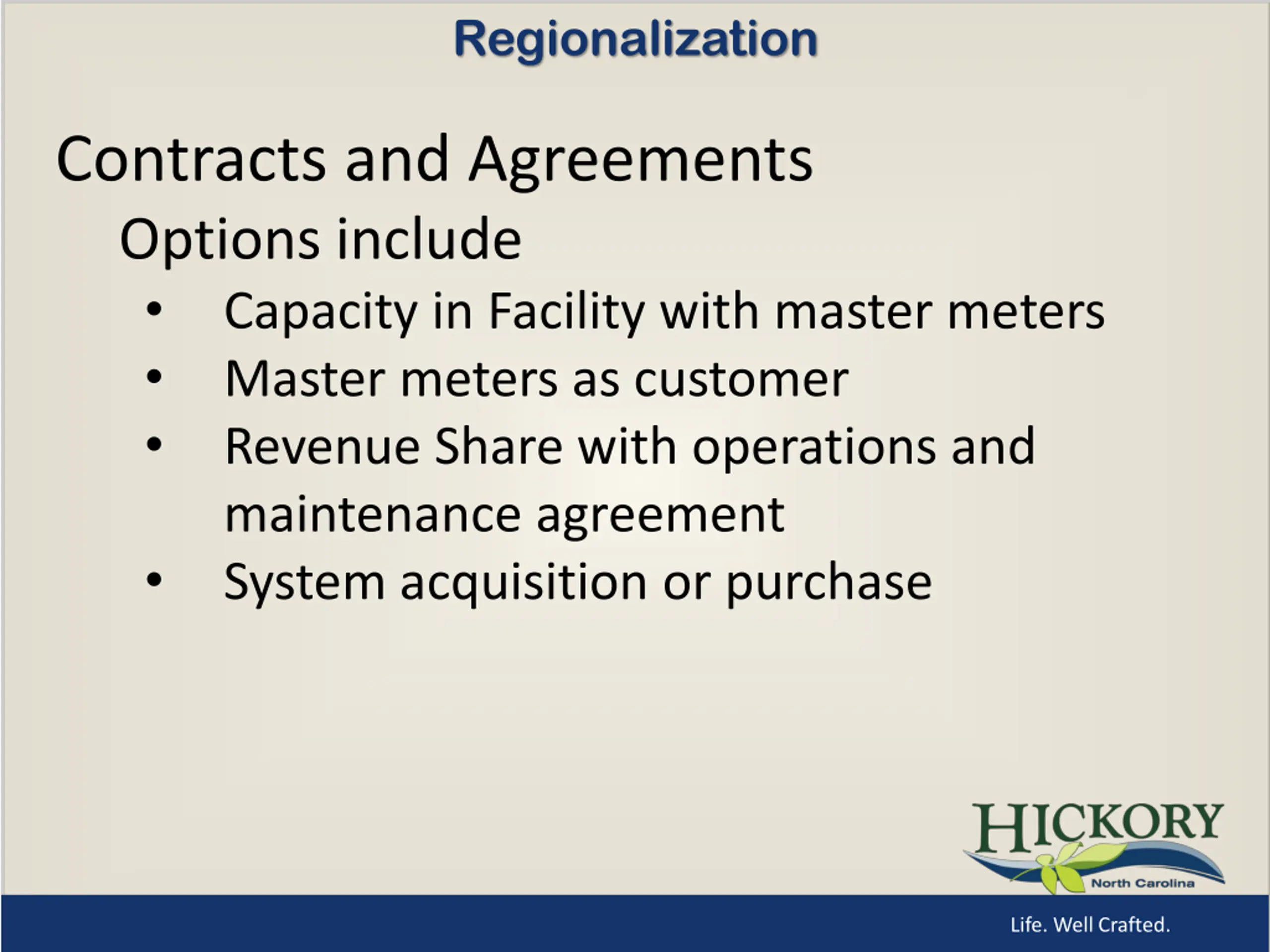 Regionalization Contracts and Agreements Options include Capacity in Facility with master meters Master meters as customer Revenue Share with operations and maintenance agreement System acquisition or purchase Life. Well Crafted.