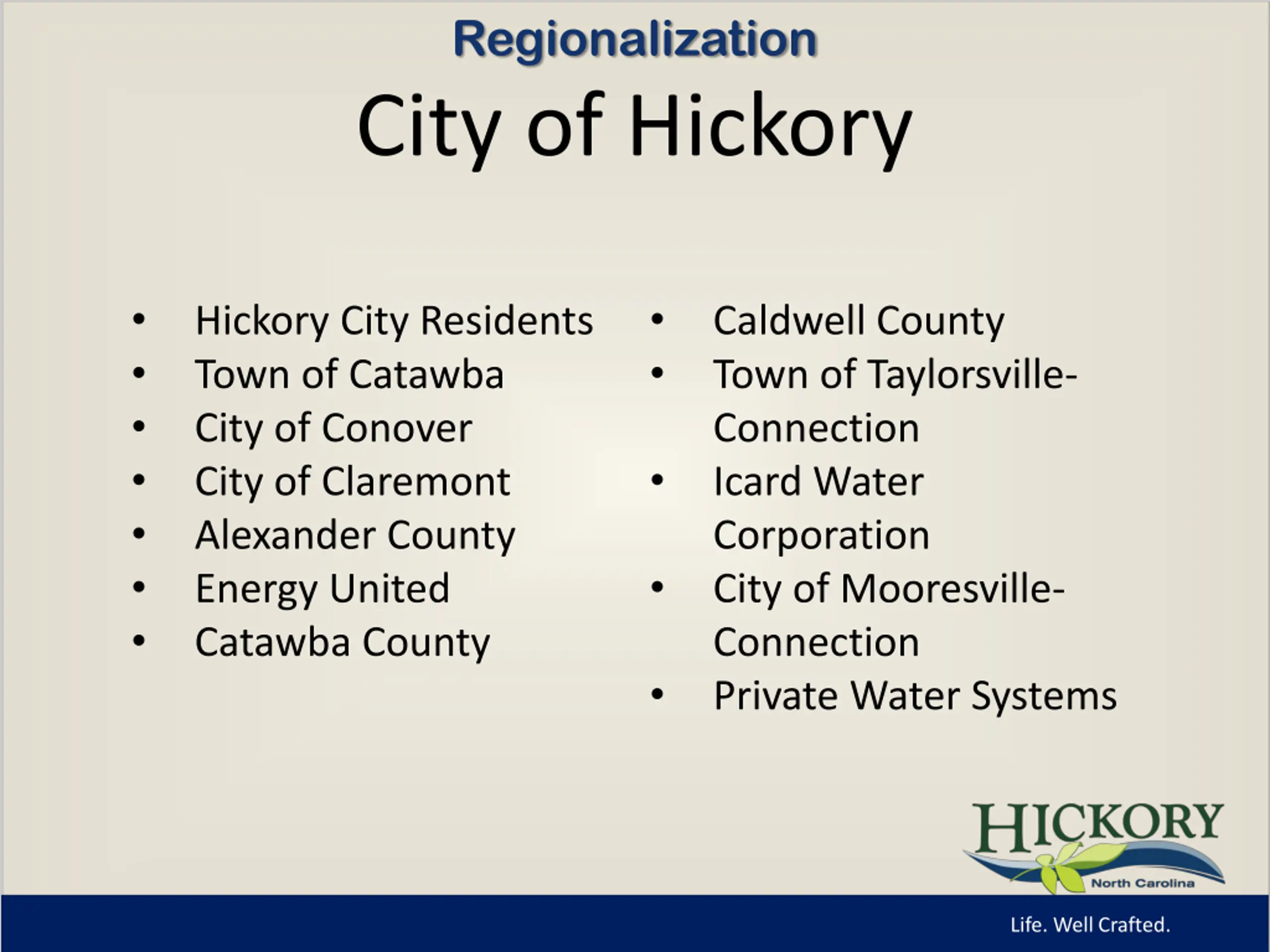Regionalization City of Hickory Hickory City Residents Town of Catawba City of Conover City of Claremont Alexander County Energy United Catawba County Caldwell County Town of Taylorsville- Connection Icard Water Corporation City of Mooresville- Connection Private Water Systems Life. Well Crafted.