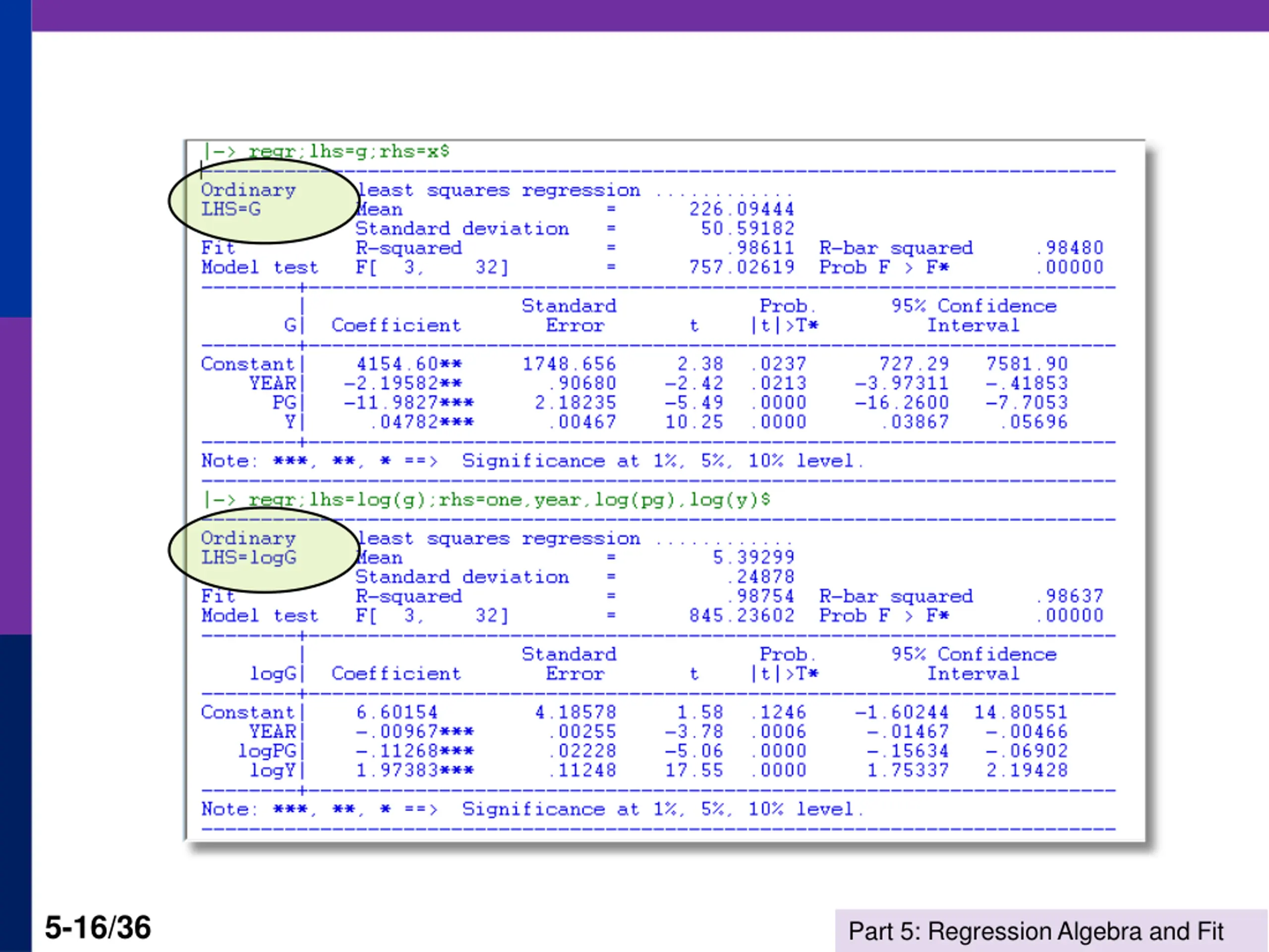 Comparing fits of regressions Make sure the denominator in R2 is the same - i.e., same left hand side variable. Example, linear vs. loglinear. Loglinear will almost always appear to fit better because taking logs reduces variation. 5-15/36 Part 5: Regression Algebra and Fit