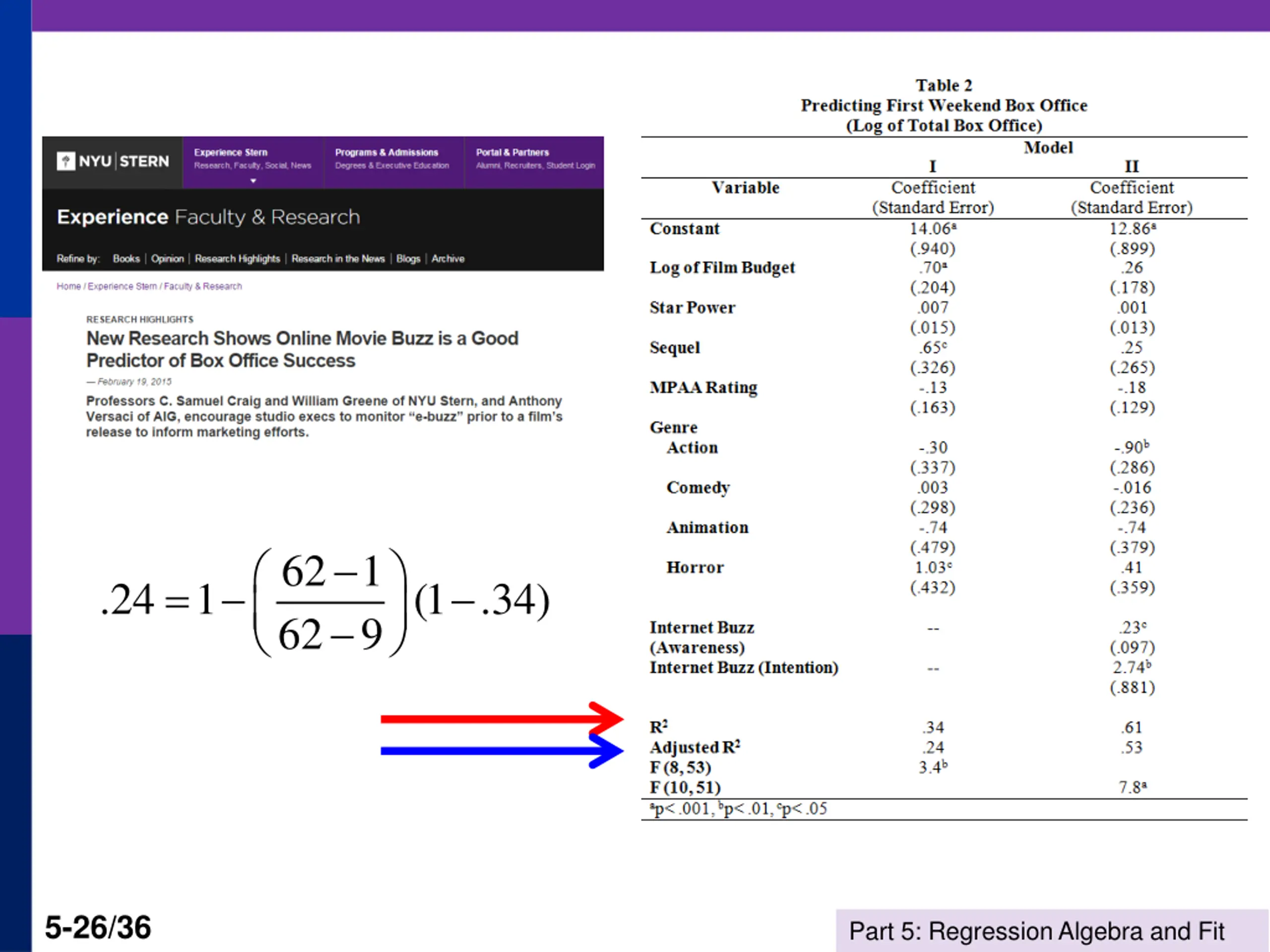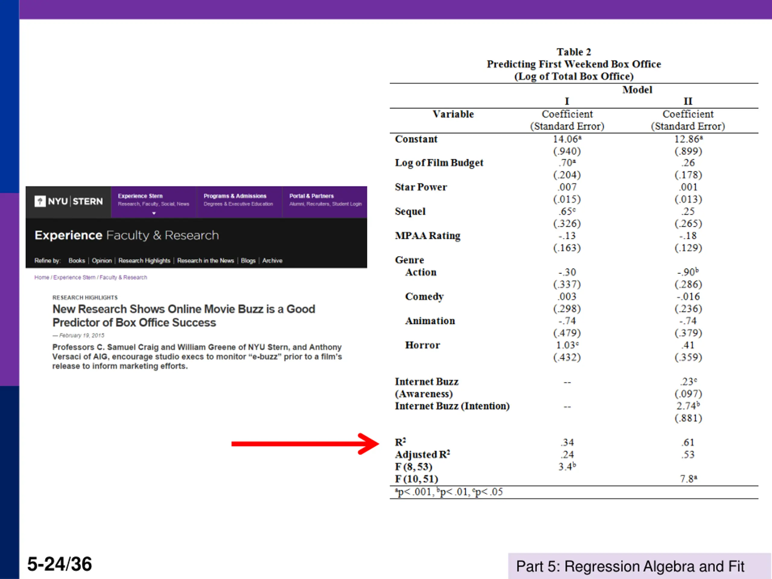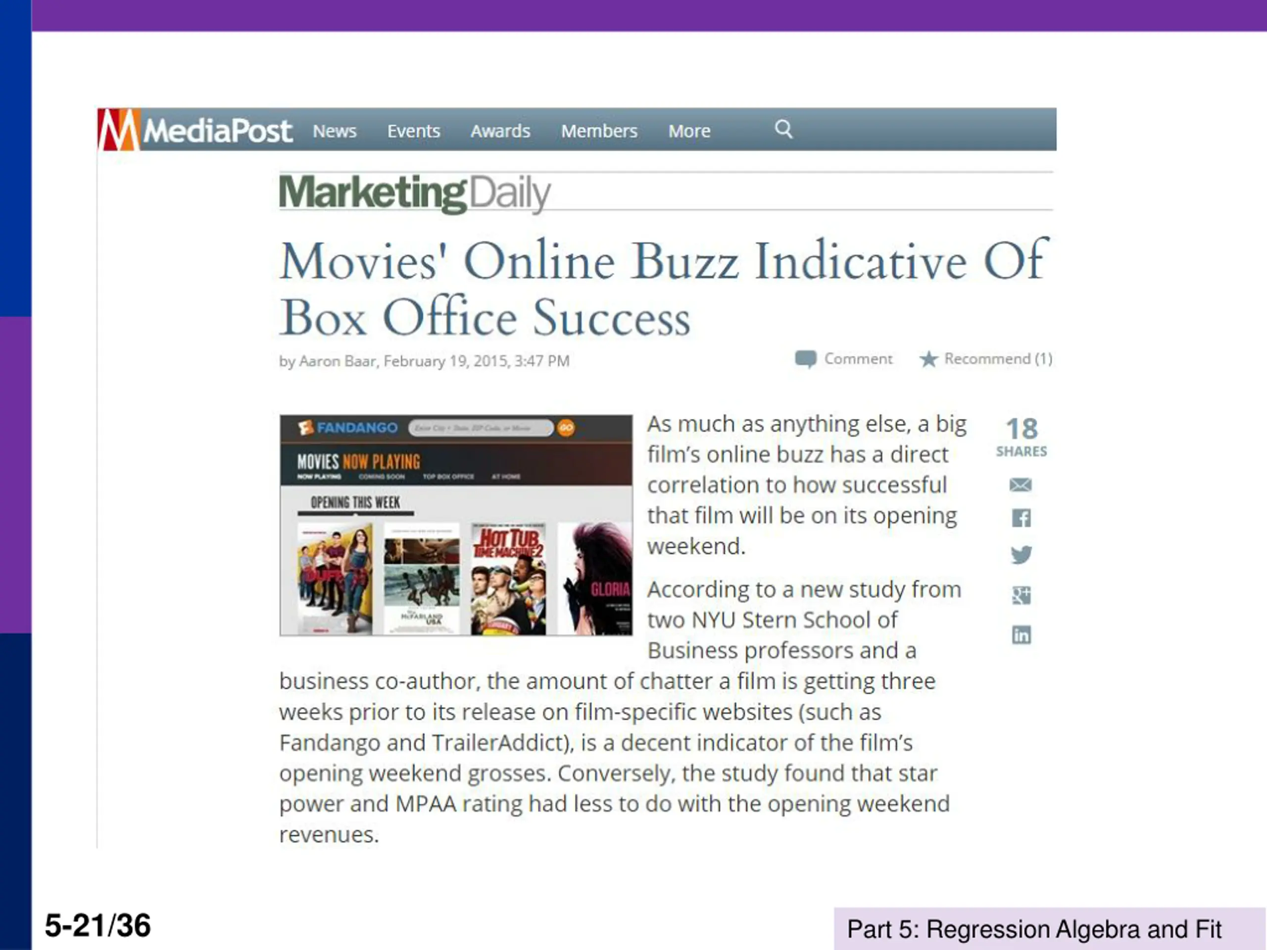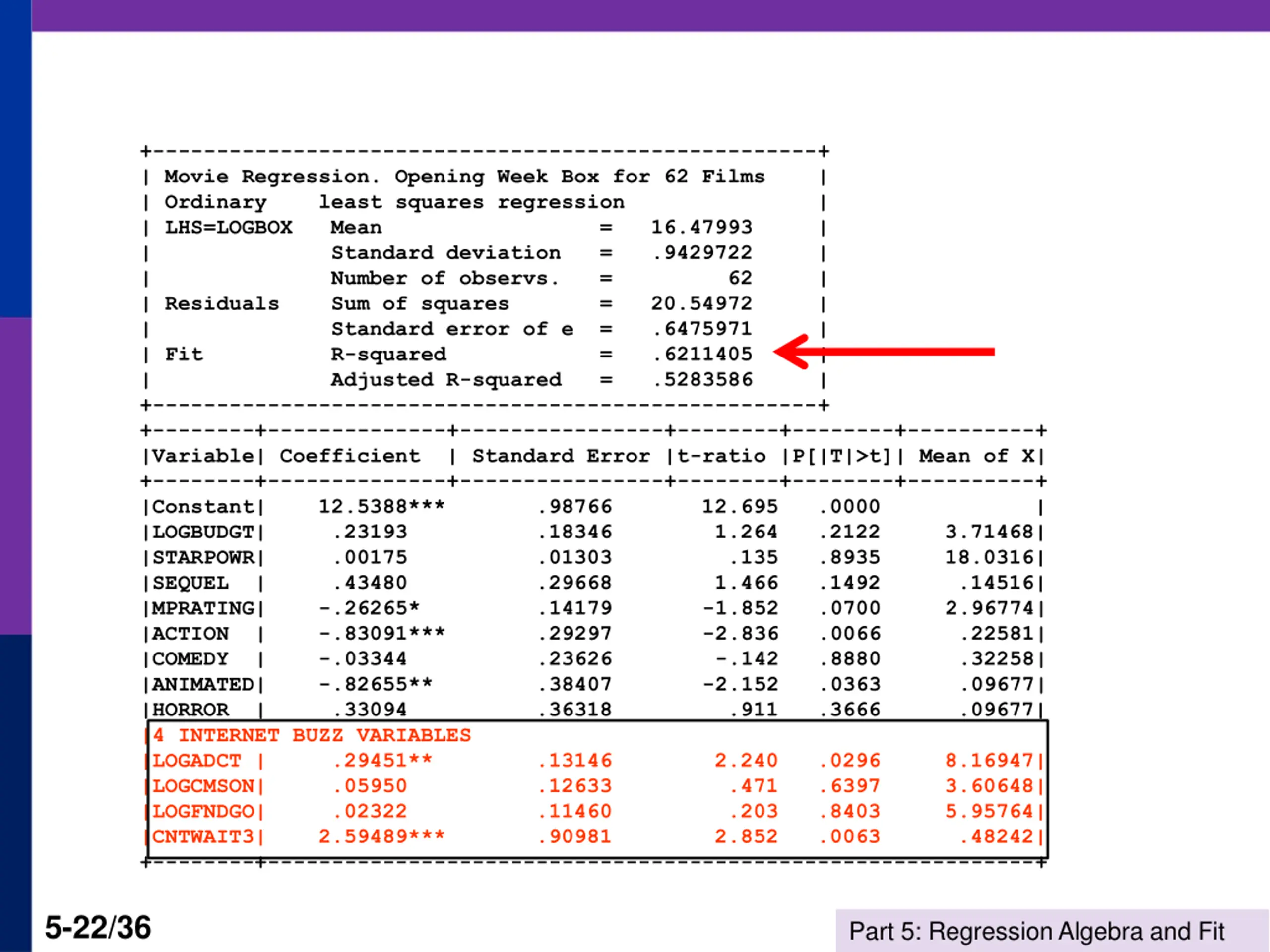 +----------------------------------------------------+ | Movie Regression. Opening Week Box for 62 Films | | Ordinary least squares regression | | LHS=LOGBOX Mean = 16.47993 | | Standard deviation = .9429722 | | Number of observs. = 62 | | Residuals Sum of squares = 20.54972 | | Standard error of e = .6475971 | | Fit R-squared = .6211405 | | Adjusted R-squared = .5283586 | +----------------------------------------------------+ +--------+--------------+----------------+--------+--------+----------+ |Variable| Coefficient | Standard Error |t-ratio |P[|T|>t]| Mean of X| +--------+--------------+----------------+--------+--------+----------+ |Constant| 12.5388*** .98766 12.695 .0000 | |LOGBUDGT| .23193 .18346 1.264 .2122 3.71468| |STARPOWR| .00175 .01303 .135 .8935 18.0316| |SEQUEL | .43480 .29668 1.466 .1492 .14516| |MPRATING| -.26265* .14179 -1.852 .0700 2.96774| |ACTION | -.83091*** .29297 -2.836 .0066 .22581| |COMEDY | -.03344 .23626 -.142 .8880 .32258| |ANIMATED| -.82655** .38407 -2.152 .0363 .09677| |HORROR | .33094 .36318 .911 .3666 .09677| |4 INTERNET BUZZ VARIABLES |LOGADCT | .29451** .13146 2.240 .0296 8.16947| |LOGCMSON| .05950 .12633 .471 .6397 3.60648| |LOGFNDGO| .02322 .11460 .203 .8403 5.95764| |CNTWAIT3| 2.59489*** .90981 2.852 .0063 .48242| +--------+------------------------------------------------------------+ 5-22/36 Part 5: Regression Algebra and Fit