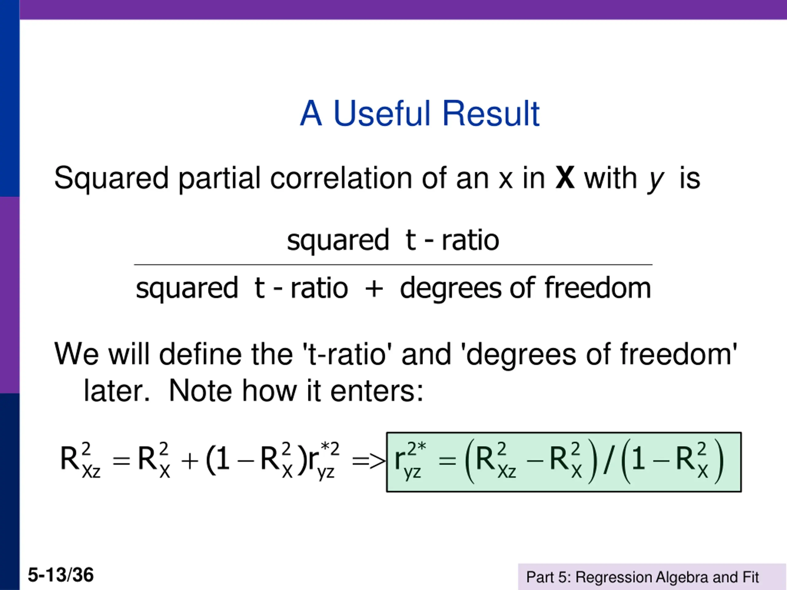 A Useful Result Squared partial correlation of an x in X with y is squared t - ratio squared t - ratio + degrees of freedom We will define the 't-ratio' and 'degrees of freedom' later. Note how it enters: 2 2 2 *2 Xz X X yz R R (1 R )r r = + = ( ) ( / 1 R ) 2* yz 2 Xz 2 X 2 X = R R 5-13/36 Part 5: Regression Algebra and Fit