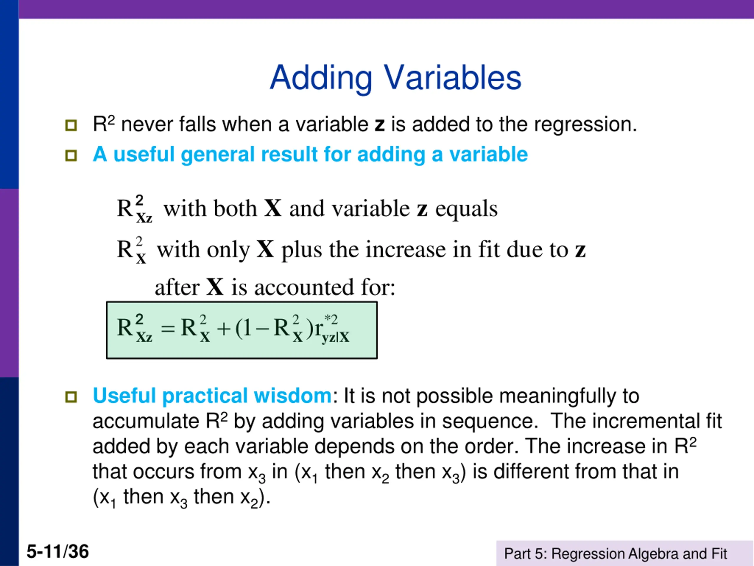 Adding Variables R2 never falls when a variable z is added to the regression. A useful general result for adding a variable 2 2 with both and variable equals X X X z R Xz 2 X z R with only plus the increase in fit due to after is accounted for: R R (1 R )r = + Xz 2 2 2 X 2 X *2 yz|X Useful practical wisdom: It is not possible meaningfully to accumulate R2 by adding variables in sequence. The incremental fit added by each variable depends on the order. The increase in R2 that occurs from x3 in (x1 then x2 then x3) is different from that in (x1 then x3 then x2). 5-11/36 Part 5: Regression Algebra and Fit