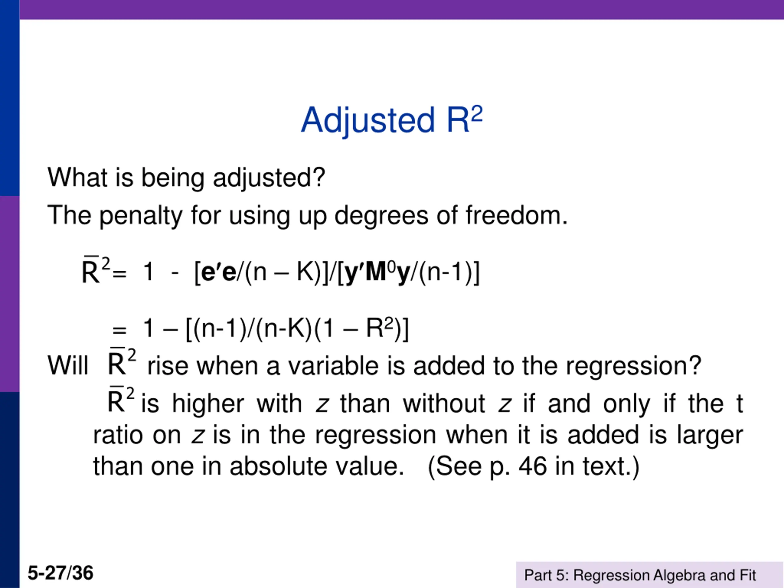 Adjusted R Squared Adjusted R2 (adjusted for degrees of freedom) = n K ( ) n 1 2 2 R 1 1 R Degrees of freedom adjustment. includes a penalty for variables that don t add much fit. Can fall when a variable is added to the equation. 2 R 5-25/36 Part 5: Regression Algebra and Fit