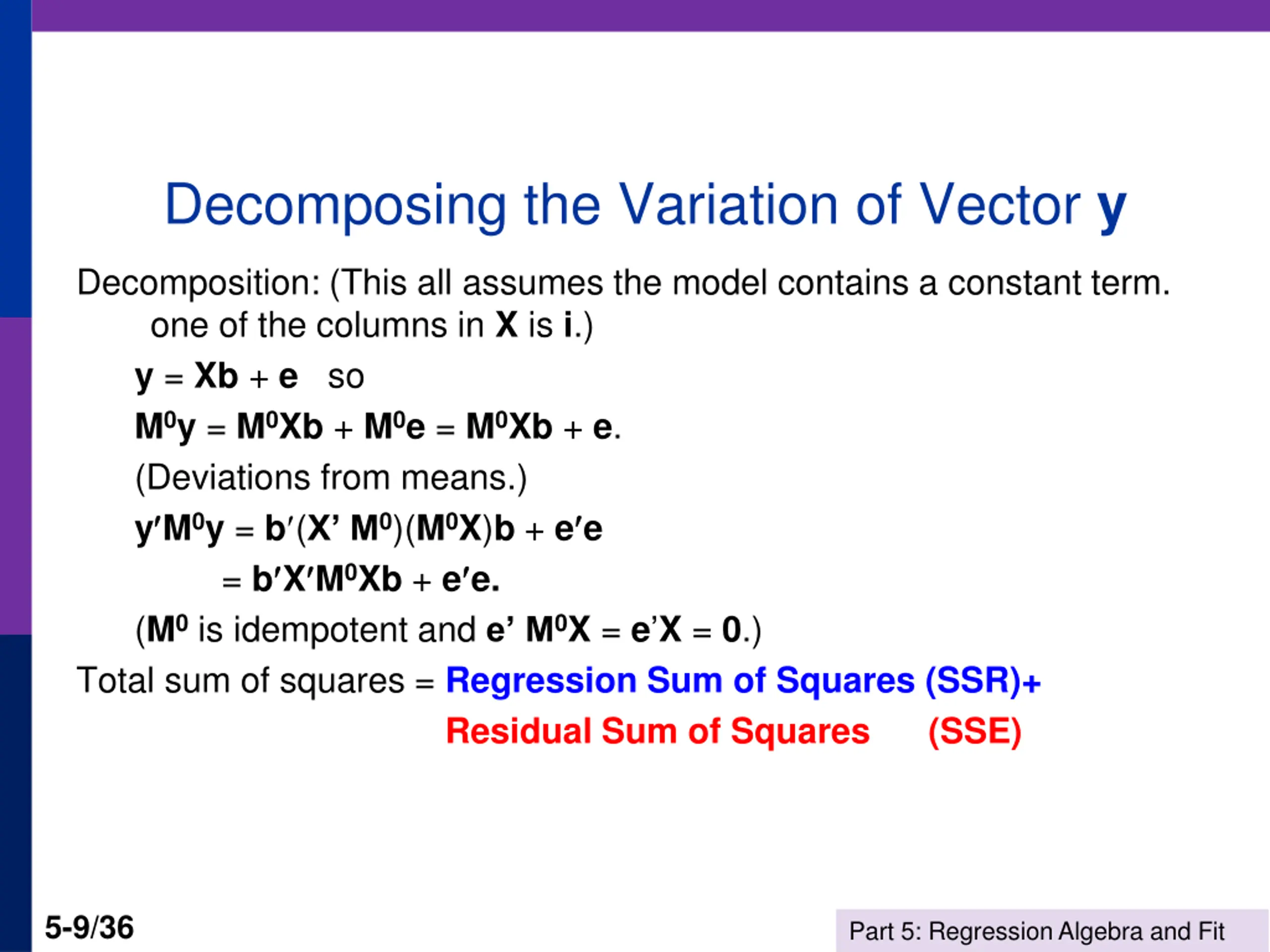 Decomposing the Variation of Vector y Decomposition: (This all assumes the model contains a constant term. one of the columns in X is i.) y = Xb + e so M0y = M0Xb + M0e = M0Xb + e. (Deviations from means.) y M0y = b (X M0)(M0X)b + e e = b X M0Xb + e e. (M0 is idempotent and e M0X = e X = 0.) Total sum of squares = Regression Sum of Squares (SSR)+ Residual Sum of Squares (SSE) 5-9/36 Part 5: Regression Algebra and Fit
