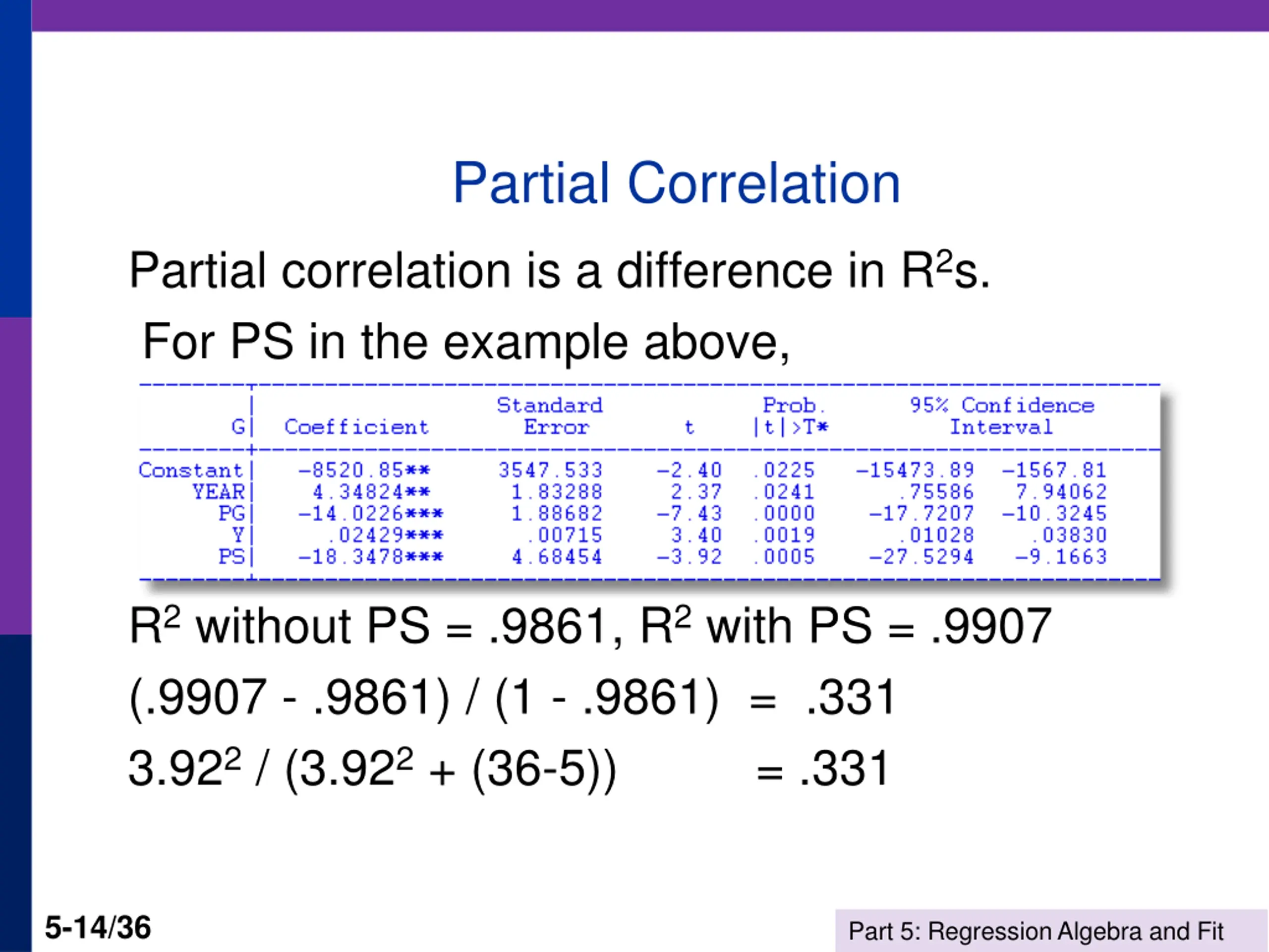 Partial Correlation Partial correlation is a difference in R2s. For PS in the example above, R2 without PS = .9861, R2 with PS = .9907 (.9907 - .9861) / (1 - .9861) = .331 3.922 / (3.922 + (36-5)) = .331 5-14/36 Part 5: Regression Algebra and Fit