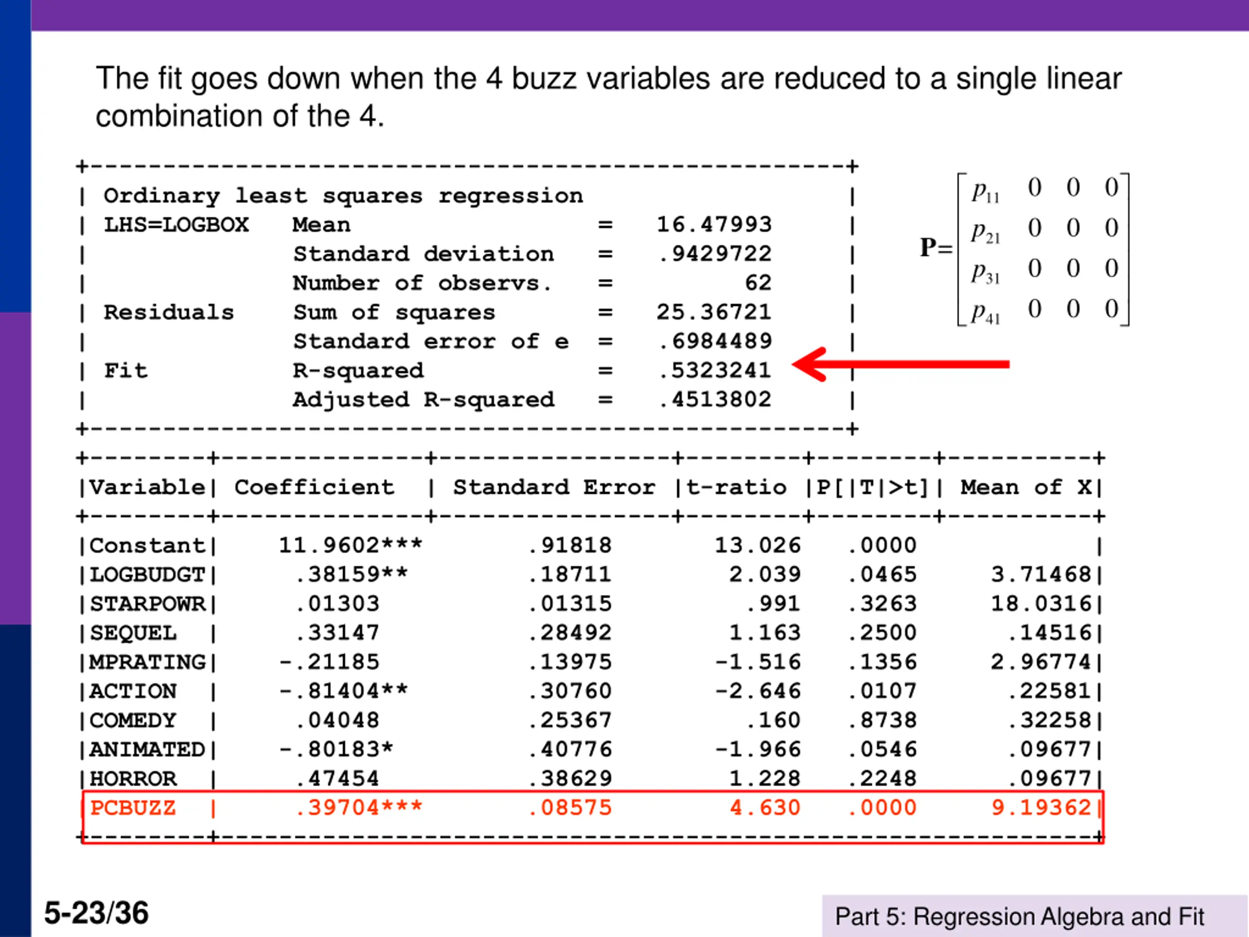 The fit goes down when the 4 buzz variables are reduced to a single linear combination of the 4. +----------------------------------------------------+ | Ordinary least squares regression | LHS=LOGBOX Mean = 16.47993 | | Standard deviation = .9429722 | | Number of observs. = 62 | | Residuals Sum of squares = 25.36721 | | Standard error of e = .6984489 | | Fit R-squared = .5323241 | | Adjusted R-squared = .4513802 | +----------------------------------------------------+ +--------+--------------+----------------+--------+--------+----------+ |Variable| Coefficient | Standard Error |t-ratio |P[|T|>t]| Mean of X| +--------+--------------+----------------+--------+--------+----------+ |Constant| 11.9602*** .91818 13.026 .0000 | |LOGBUDGT| .38159** .18711 2.039 .0465 3.71468| |STARPOWR| .01303 .01315 .991 .3263 18.0316| |SEQUEL | .33147 .28492 1.163 .2500 .14516| |MPRATING| -.21185 .13975 -1.516 .1356 2.96774| |ACTION | -.81404** .30760 -2.646 .0107 .22581| |COMEDY | .04048 .25367 .160 .8738 .32258| |ANIMATED| -.80183* .40776 -1.966 .0546 .09677| |HORROR | .47454 .38629 1.228 .2248 .09677| |PCBUZZ | .39704*** .08575 4.630 .0000 9.19362| +--------+------------------------------------------------------------+ 0 0 0 0 0 0 0 0 0 0 0 0 p p p p | 11 21 P = 31 41 5-23/36 Part 5: Regression Algebra and Fit