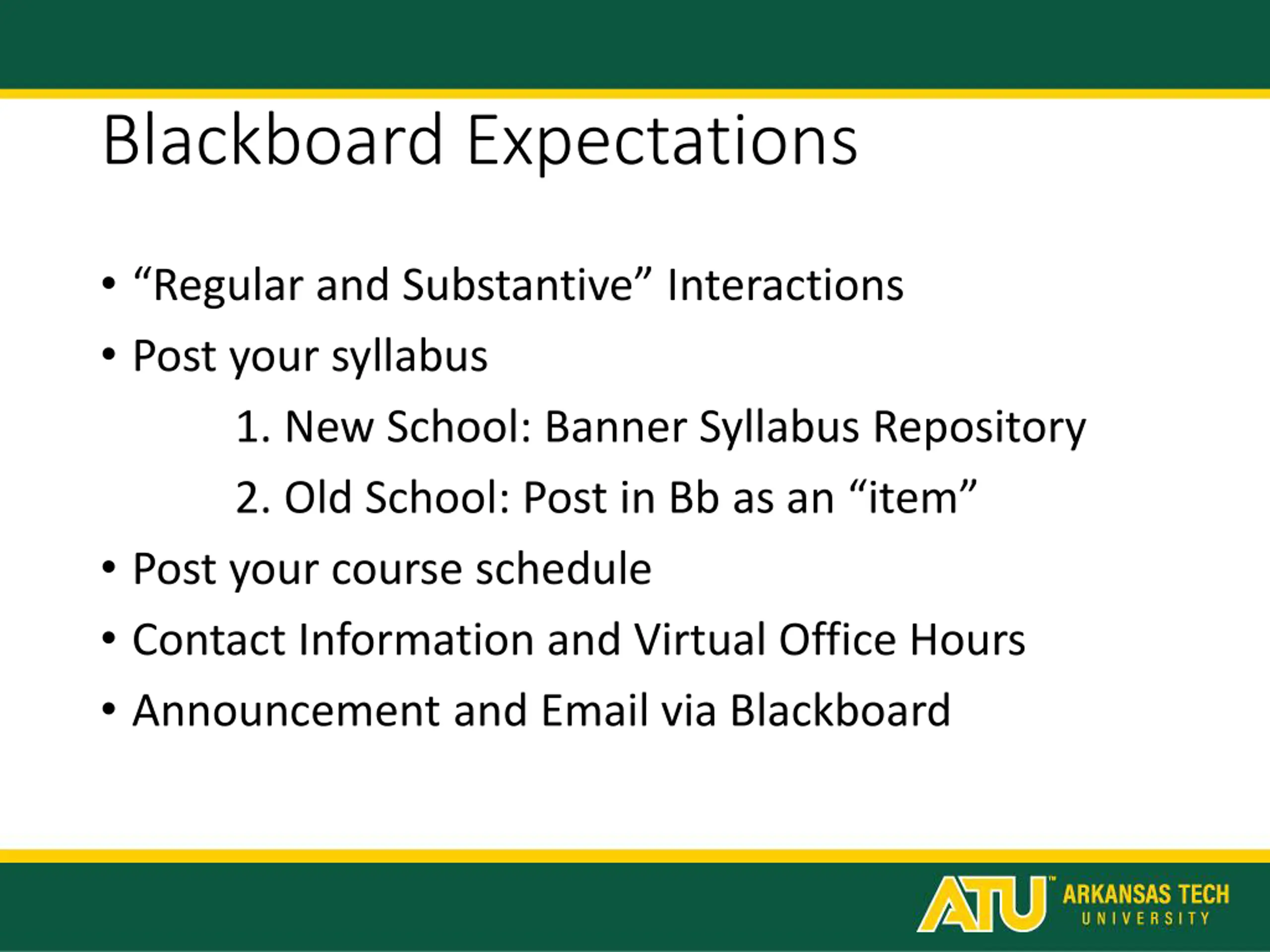 Blackboard Expectations Regular and Substantive Interactions Post your syllabus 1. New School: Banner Syllabus Repository 2. Old School: Post in Bb as an item Post your course schedule Contact Information and Virtual Office Hours Announcement and Email via Blackboard