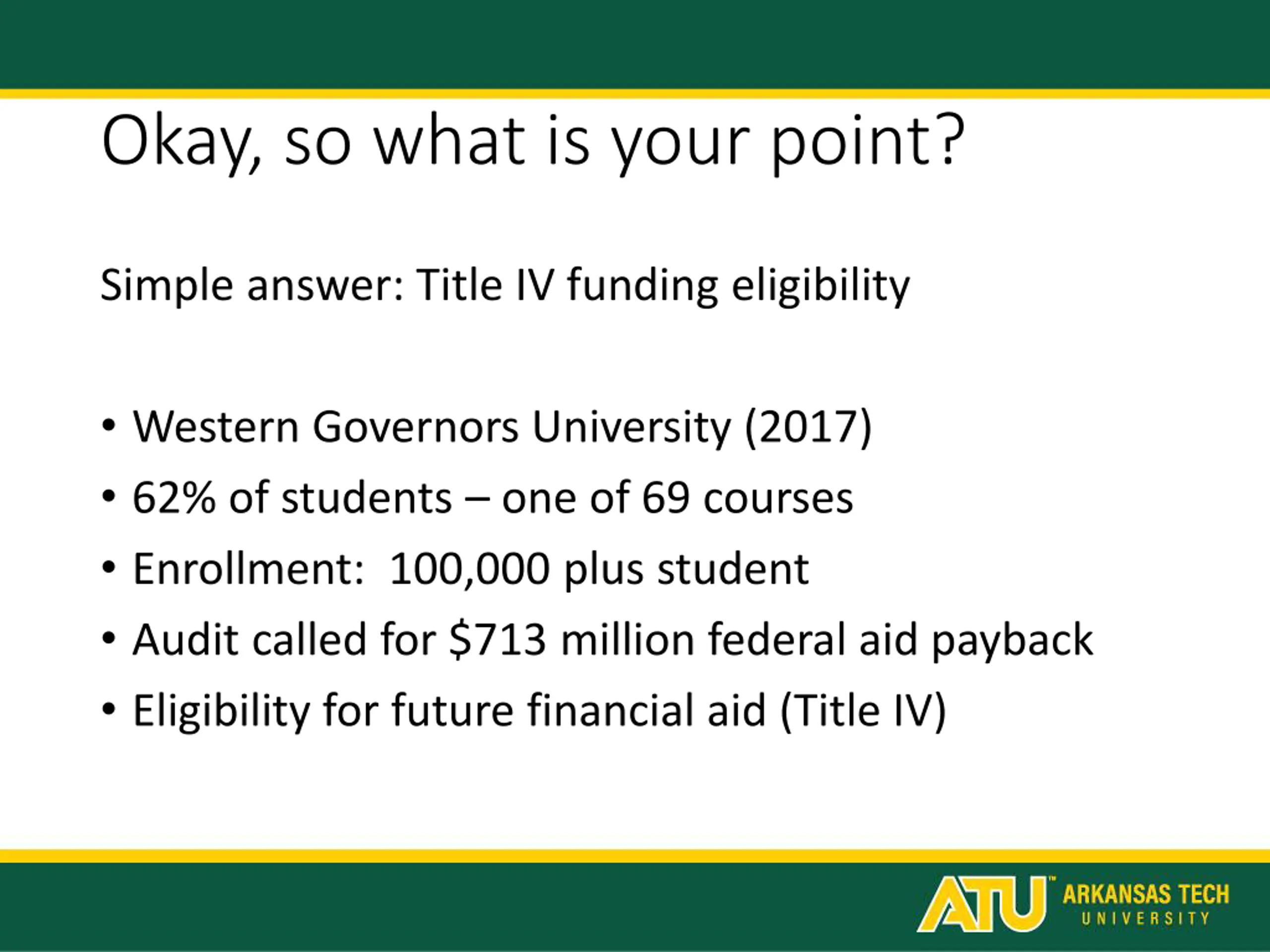Okay, so what is your point? Simple answer: Title IV funding eligibility Western Governors University (2017) 62% of students one of 69 courses Enrollment: 100,000 plus student Audit called for $713 million federal aid payback Eligibility for future financial aid (Title IV)