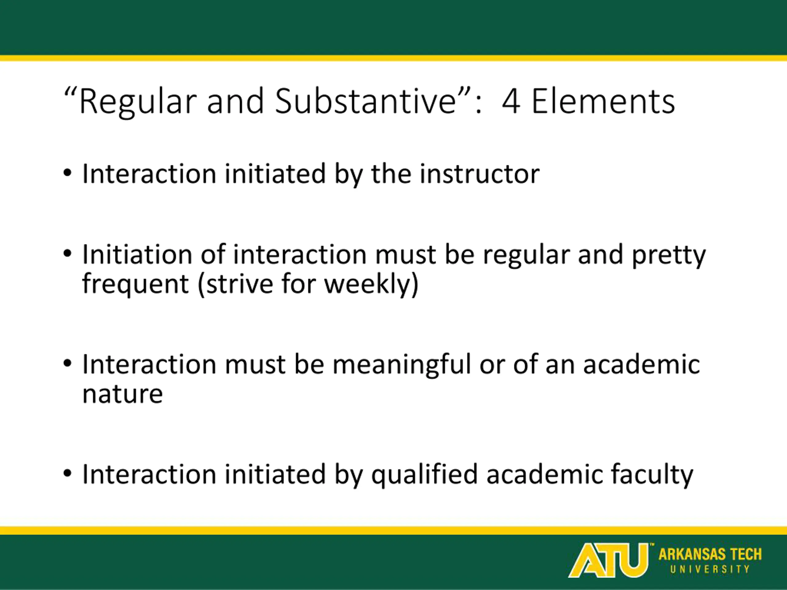 Regular and Substantive: 4 Elements Interaction initiated by the instructor Initiation of interaction must be regular and pretty frequent (strive for weekly) Interaction must be meaningful or of an academic nature Interaction initiated by qualified academic faculty