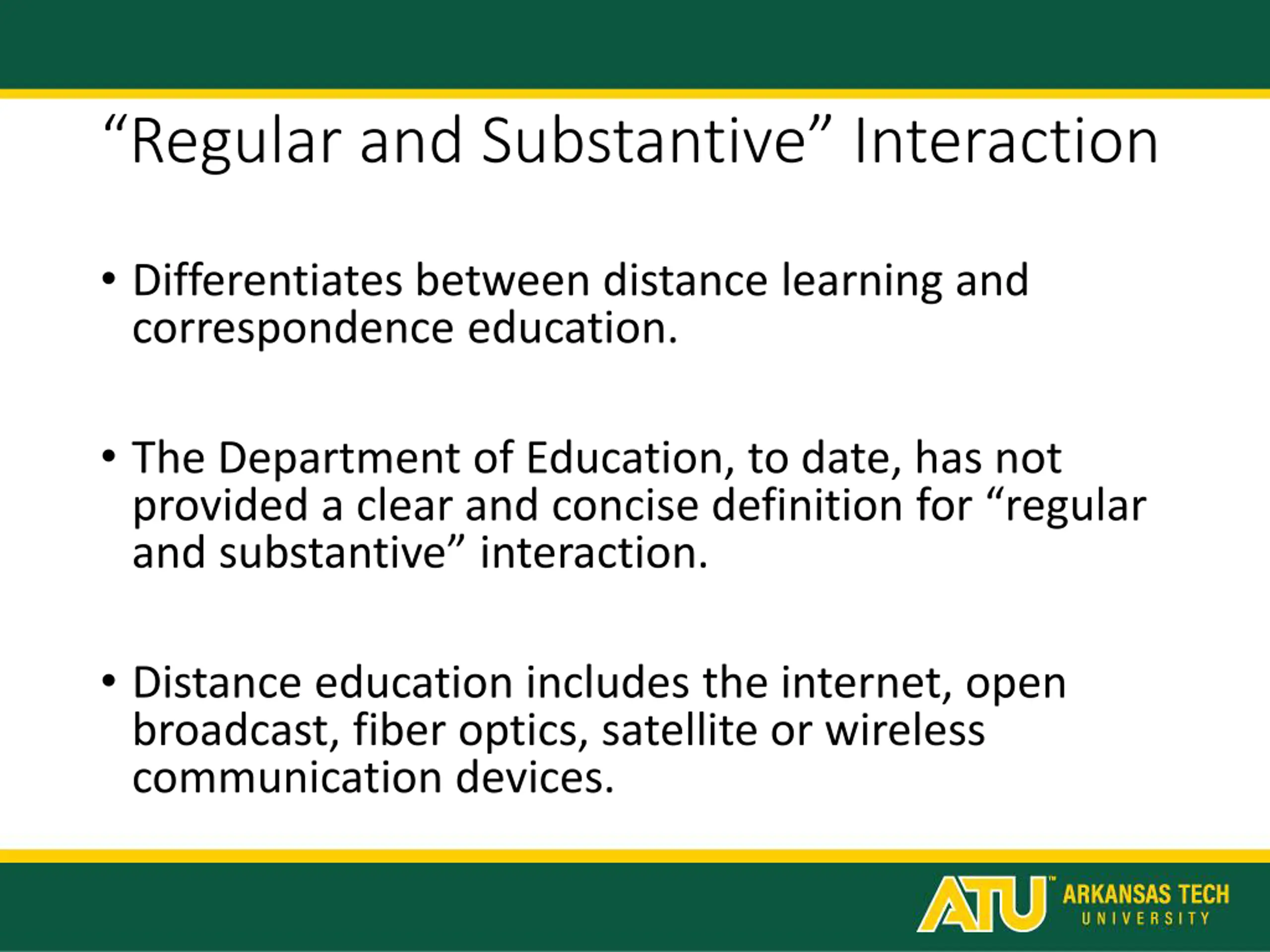 Regular and Substantive Interaction Differentiates between distance learning and correspondence education. The Department of Education, to date, has not provided a clear and concise definition for regular and substantive interaction. Distance education includes the internet, open broadcast, fiber optics, satellite or wireless communication devices.