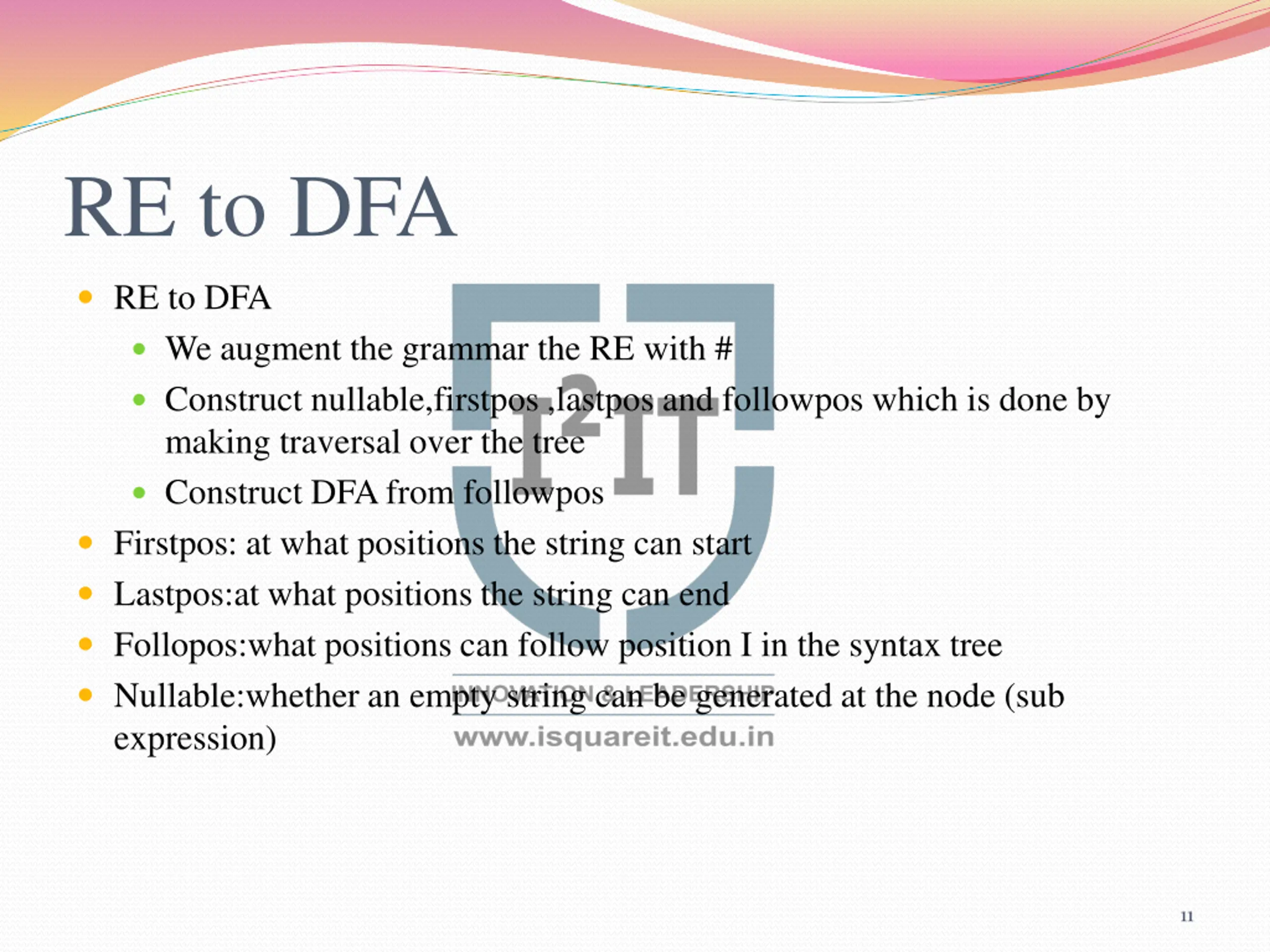 RE to DFA RE to DFA We augment the grammar the RE with # Construct nullable,firstpos ,lastpos and followpos which is done by making traversal over the tree Construct DFA from followpos Firstpos: at what positions the string can start Lastpos:at what positions the string can end Follopos:what positions can follow position I in the syntax tree Nullable:whether an empty string can be generated at the node (sub expression) 11