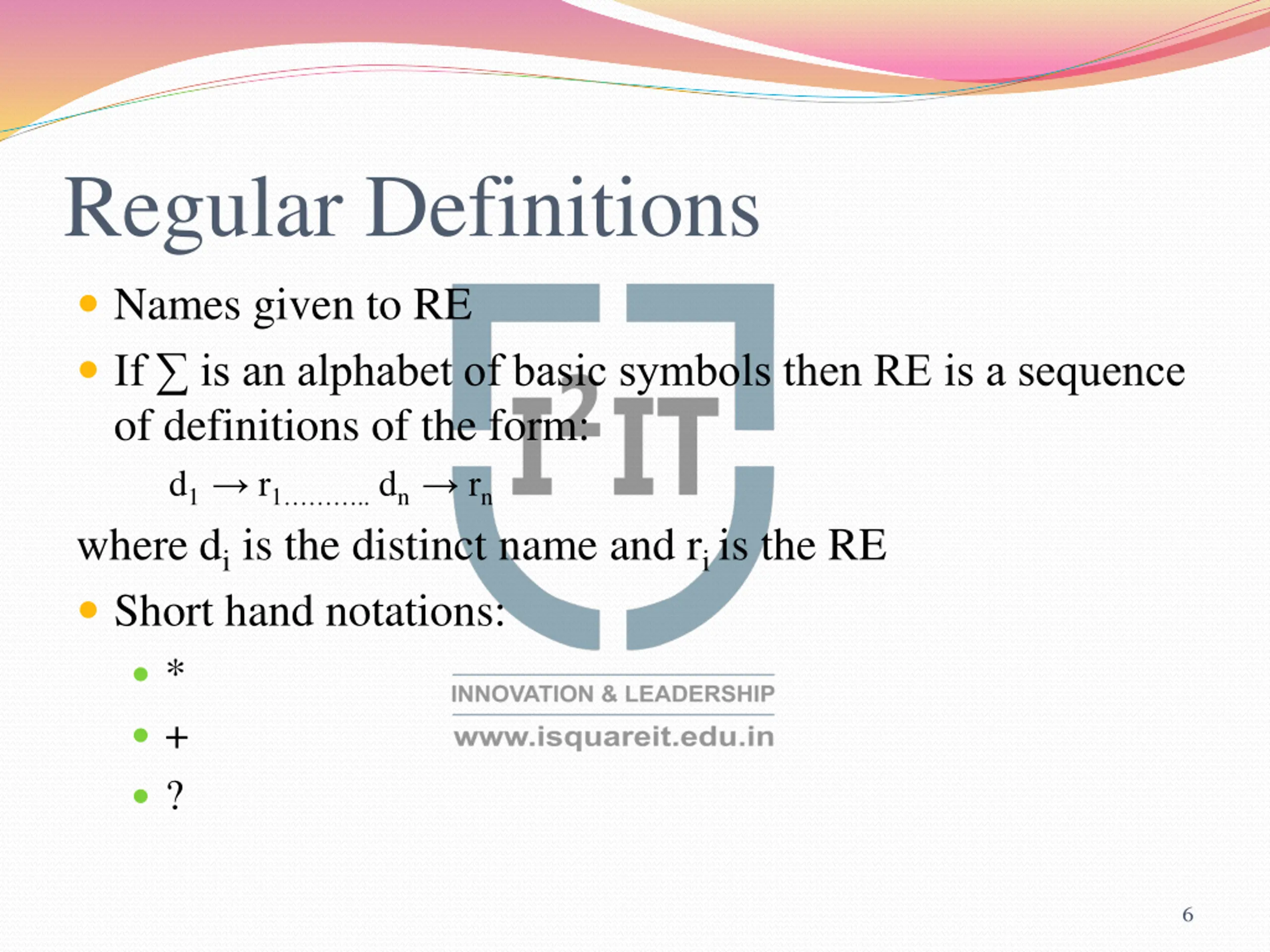 Regular Definitions Names given to RE If is an alphabet of basic symbols then RE is a sequence of definitions of the form: d1 r1 .. dn rn where di is the distinct name and ri is the RE Short hand notations: * + ? 6