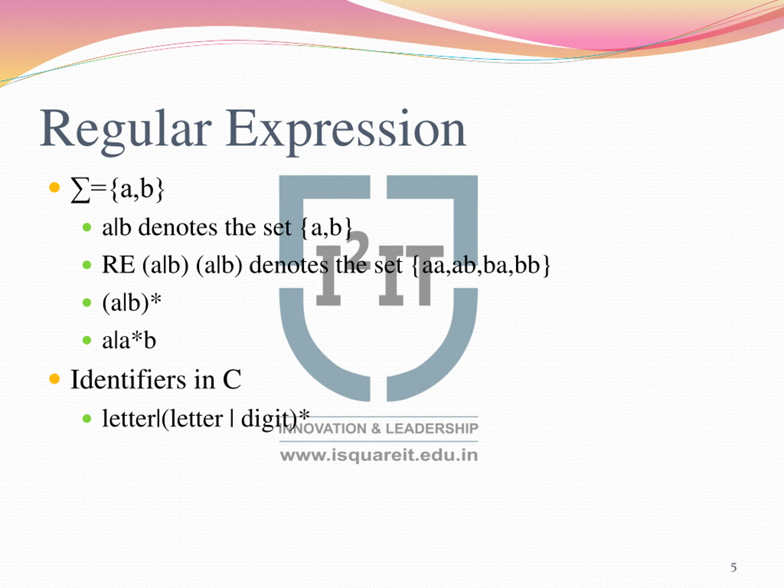 Specification of Tokens RE are notations for specifying patterns Alphabet/Character class Denotes a finite set of symbols String Strings are defined over some alphabets, is a finite sequence of symbols drawn from the alphabet Empty string denoted by Language Set of strings over some alphabet 4