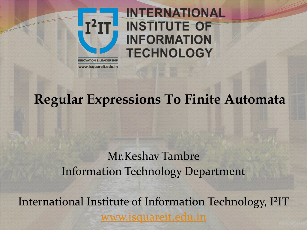 Regular Expressions To Finite Automata Mr.Keshav Tambre Information Technology Department International Institute of Information Technology, I IT www.isquareit.edu.in