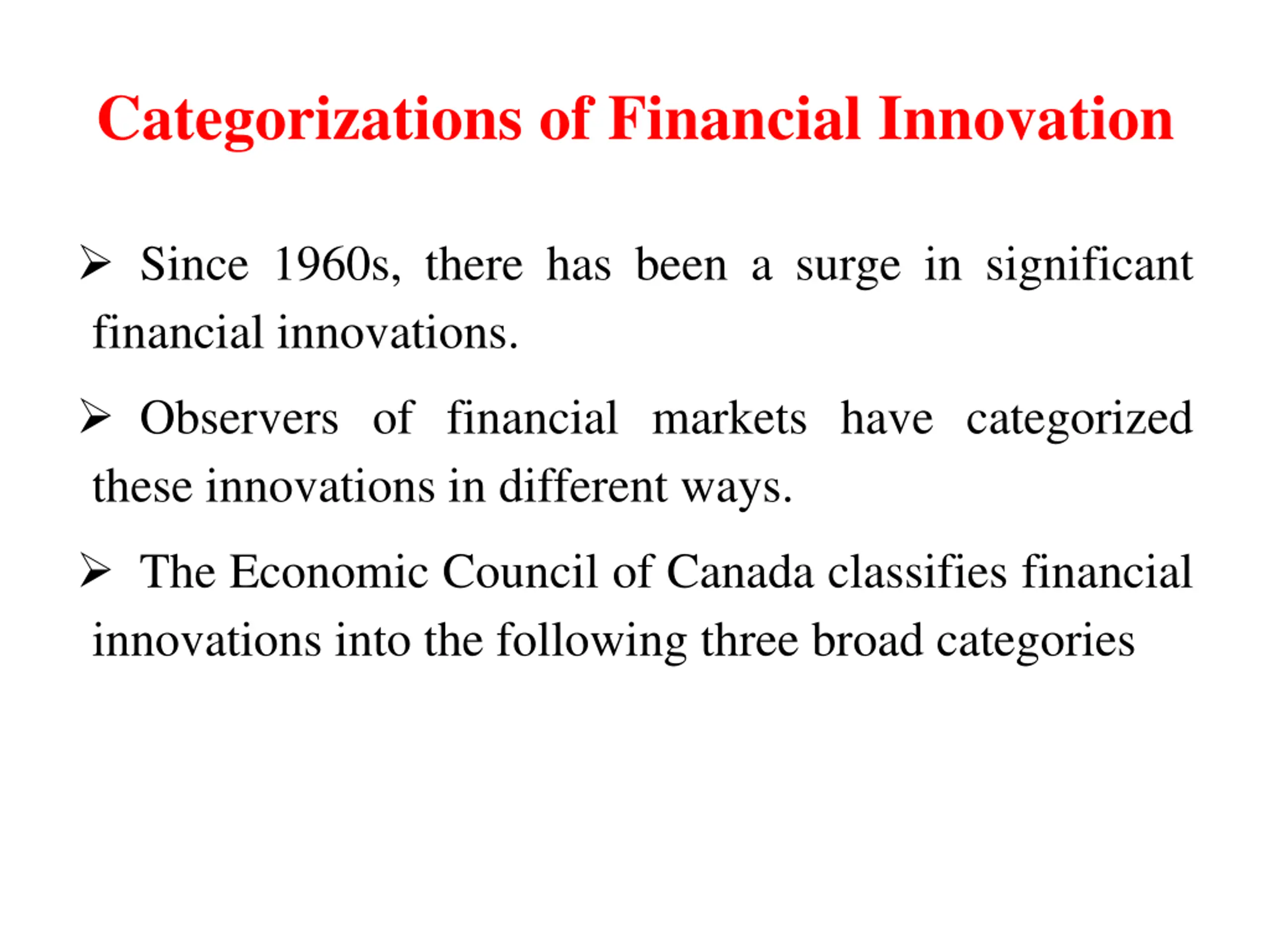 Categorizations of Financial Innovation Since 1960s, there has been a surge in significant financial innovations. Observers of financial markets have categorized these innovations in different ways. The Economic Council of Canada classifies financial innovations into the following three broad categories