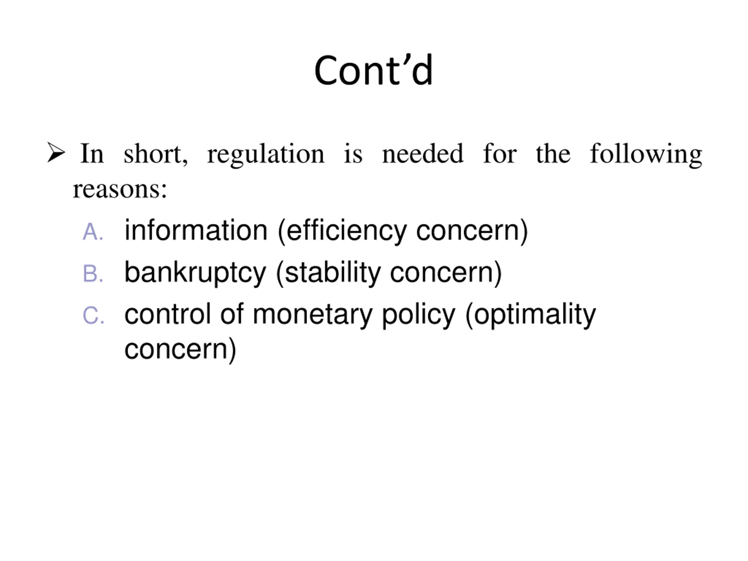 Contd In short, regulation is needed for the following reasons: A. information (efficiency concern) B. bankruptcy (stability concern) C. control of monetary policy (optimality concern)