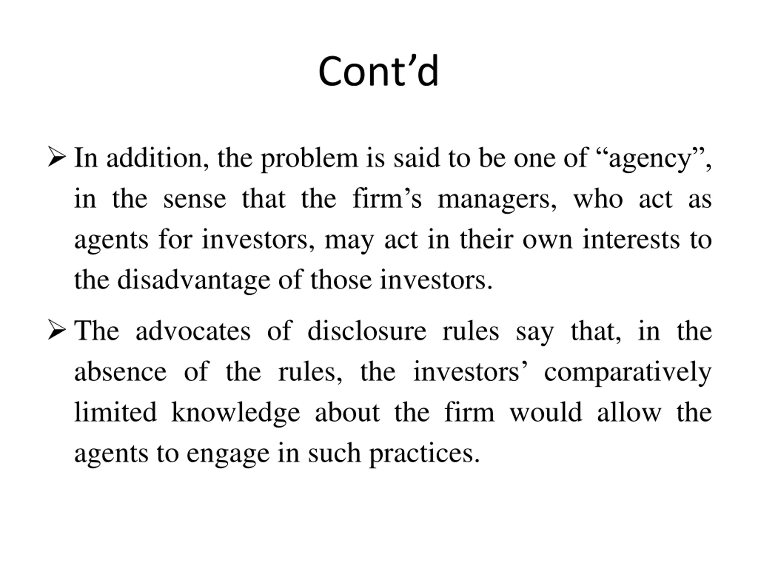 Contd In addition, the problem is said to be one of agency , in the sense that the firm s managers, who act as agents for investors, may act in their own interests to the disadvantage of those investors. The advocates of disclosure rules say that, in the absence of the rules, the investors comparatively limited knowledge about the firm would allow the agents to engage in such practices.