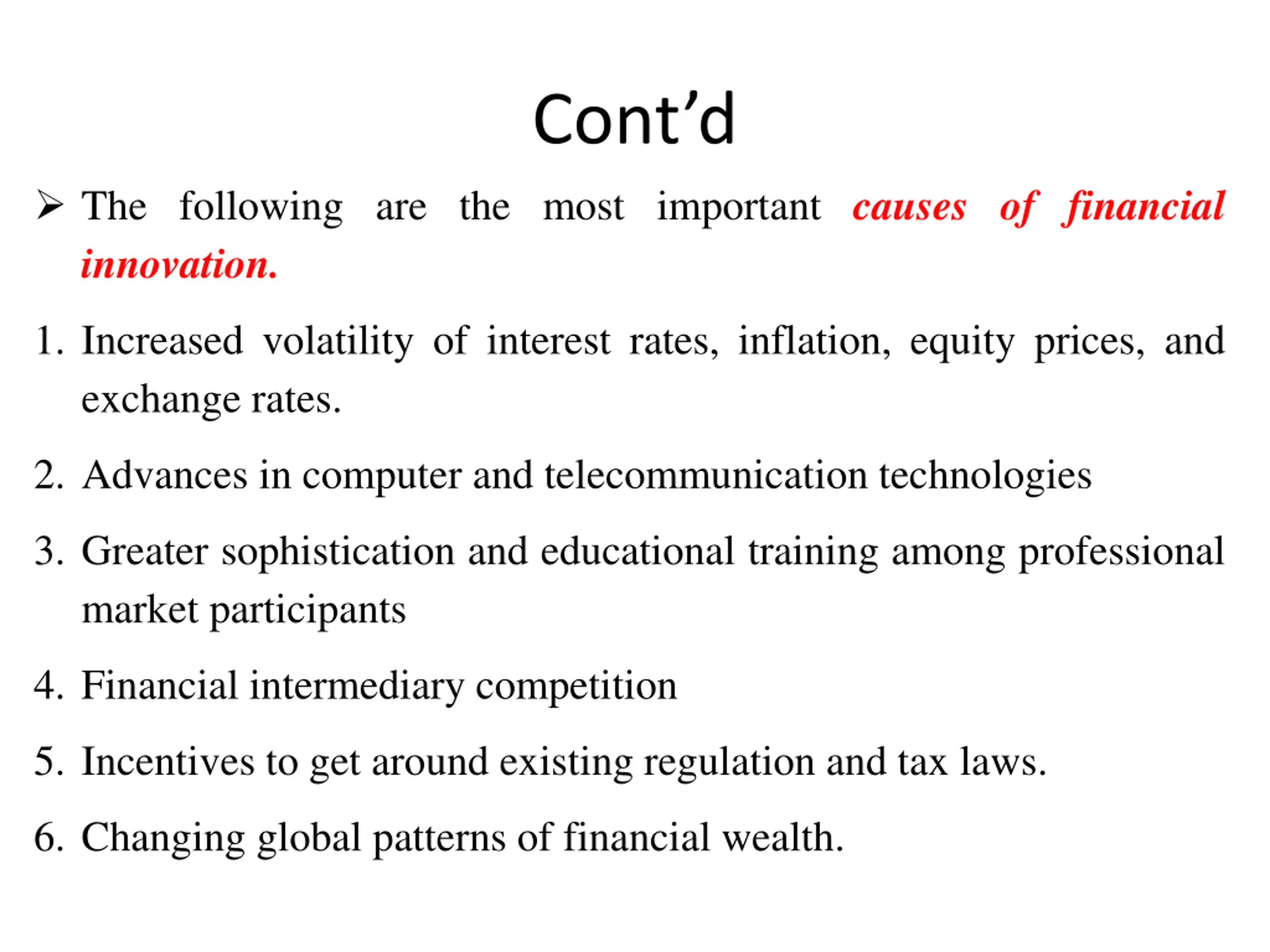 Contd The following are the most important causes of financial innovation. 1. Increased volatility of interest rates, inflation, equity prices, and exchange rates. 2. Advances in computer and telecommunication technologies 3. Greater sophistication and educational training among professional market participants 4. Financial intermediary competition 5. Incentives to get around existing regulation and tax laws. 6. Changing global patterns of financial wealth.