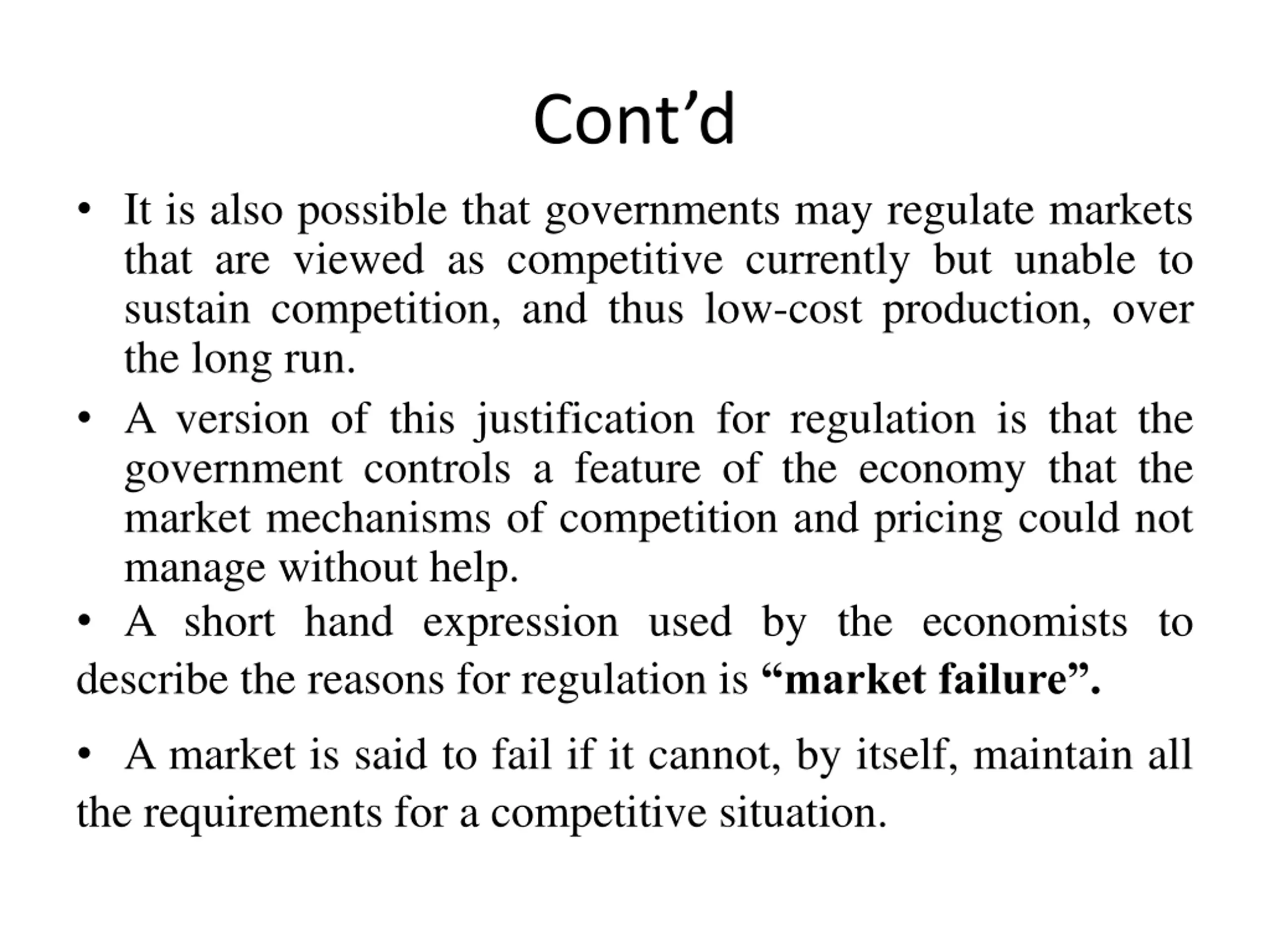 Contd It is also possible that governments may regulate markets that are viewed as competitive currently but unable to sustain competition, and thus low-cost production, over the long run. A version of this justification for regulation is that the government controls a feature of the economy that the market mechanisms of competition and pricing could not manage without help. A short hand expression used by the economists to describe the reasons for regulation is market failure . A market is said to fail if it cannot, by itself, maintain all the requirements for a competitive situation.