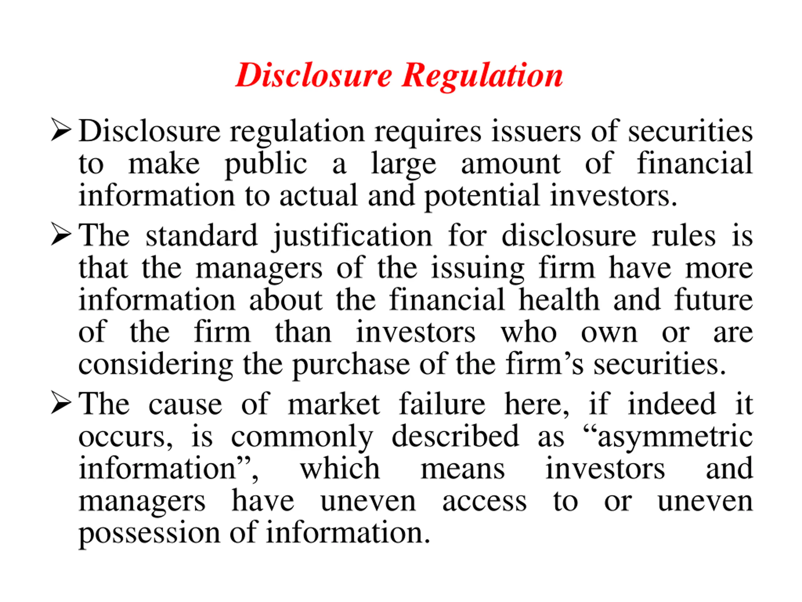 Disclosure Regulation Disclosure regulation requires issuers of securities to make public a large amount of financial information to actual and potential investors. The standard justification for disclosure rules is that the managers of the issuing firm have more information about the financial health and future of the firm than investors who own or are considering the purchase of the firm s securities. The cause of market failure here, if indeed it occurs, is commonly described as asymmetric information , which managers have uneven access to or uneven possession of information. means investors and