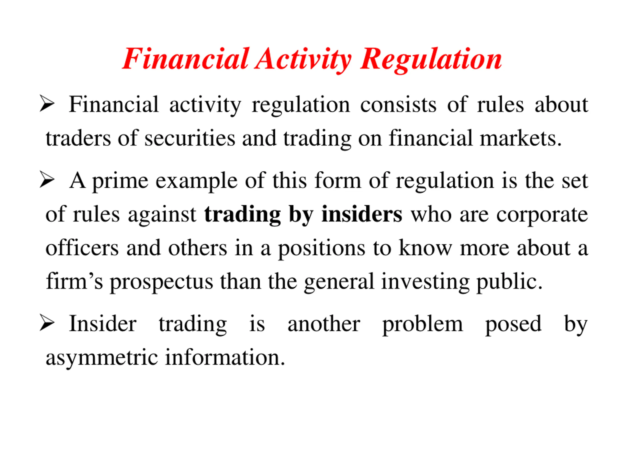 Financial Activity Regulation Financial activity regulation consists of rules about traders of securities and trading on financial markets. A prime example of this form of regulation is the set of rules against trading by insiders who are corporate officers and others in a positions to know more about a firm s prospectus than the general investing public. Insider asymmetric information. trading is another problem posed by