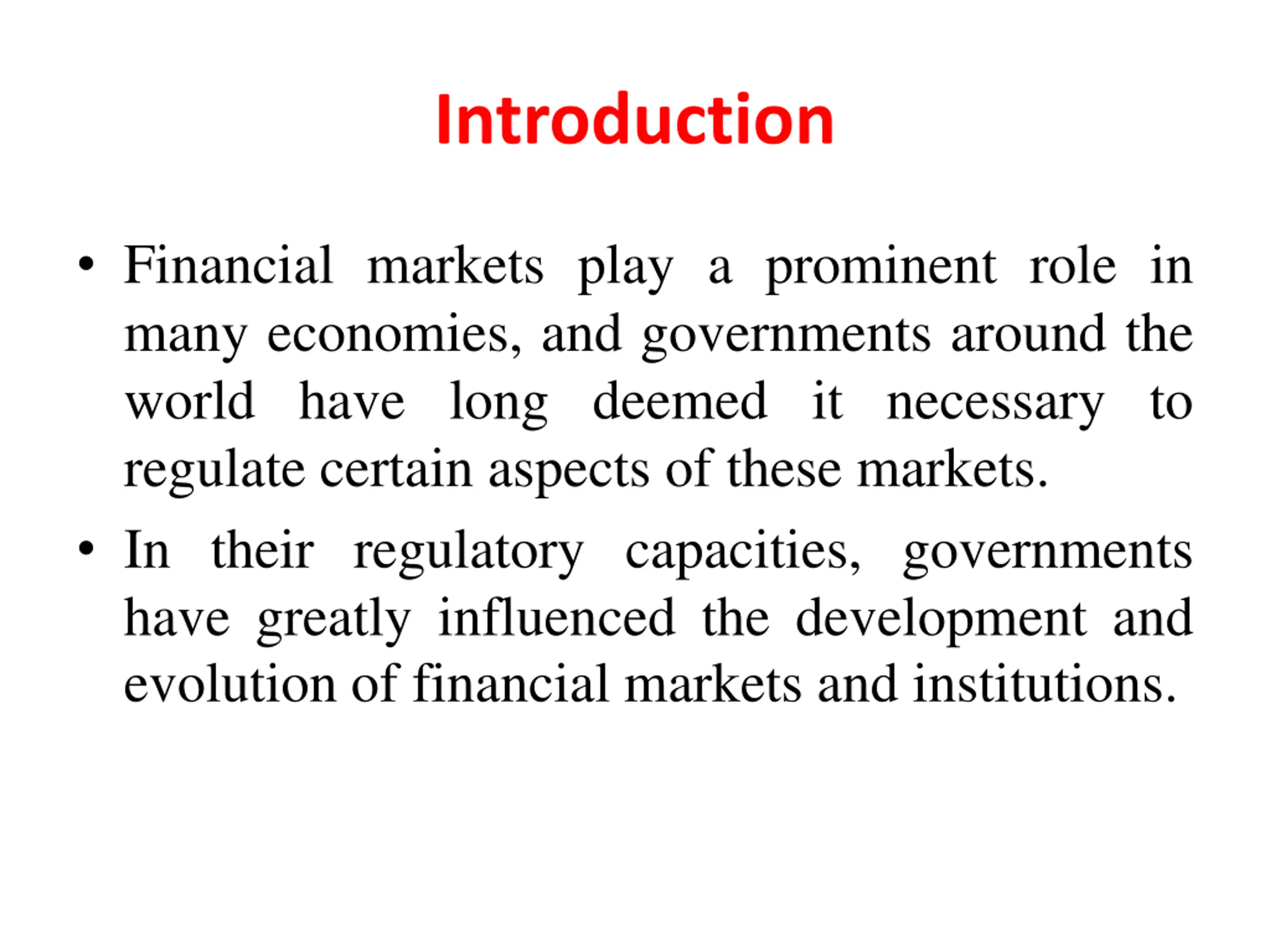 Introduction Financial markets play a prominent role in many economies, and governments around the world have long deemed it necessary to regulate certain aspects of these markets. In their regulatory capacities, governments have greatly influenced the development and evolution of financial markets and institutions.