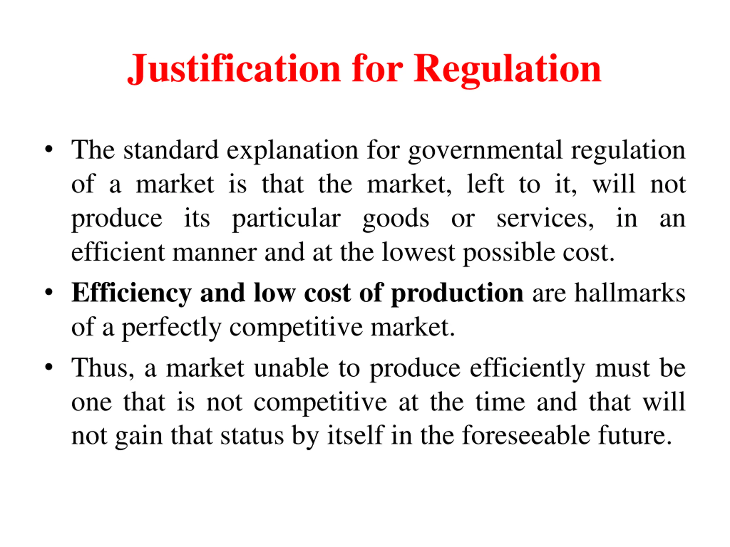 Justification for Regulation The standard explanation for governmental regulation of a market is that the market, left to it, will not produce its particular goods or services, in an efficient manner and at the lowest possible cost. Efficiency and low cost of production are hallmarks of a perfectly competitive market. Thus, a market unable to produce efficiently must be one that is not competitive at the time and that will not gain that status by itself in the foreseeable future.