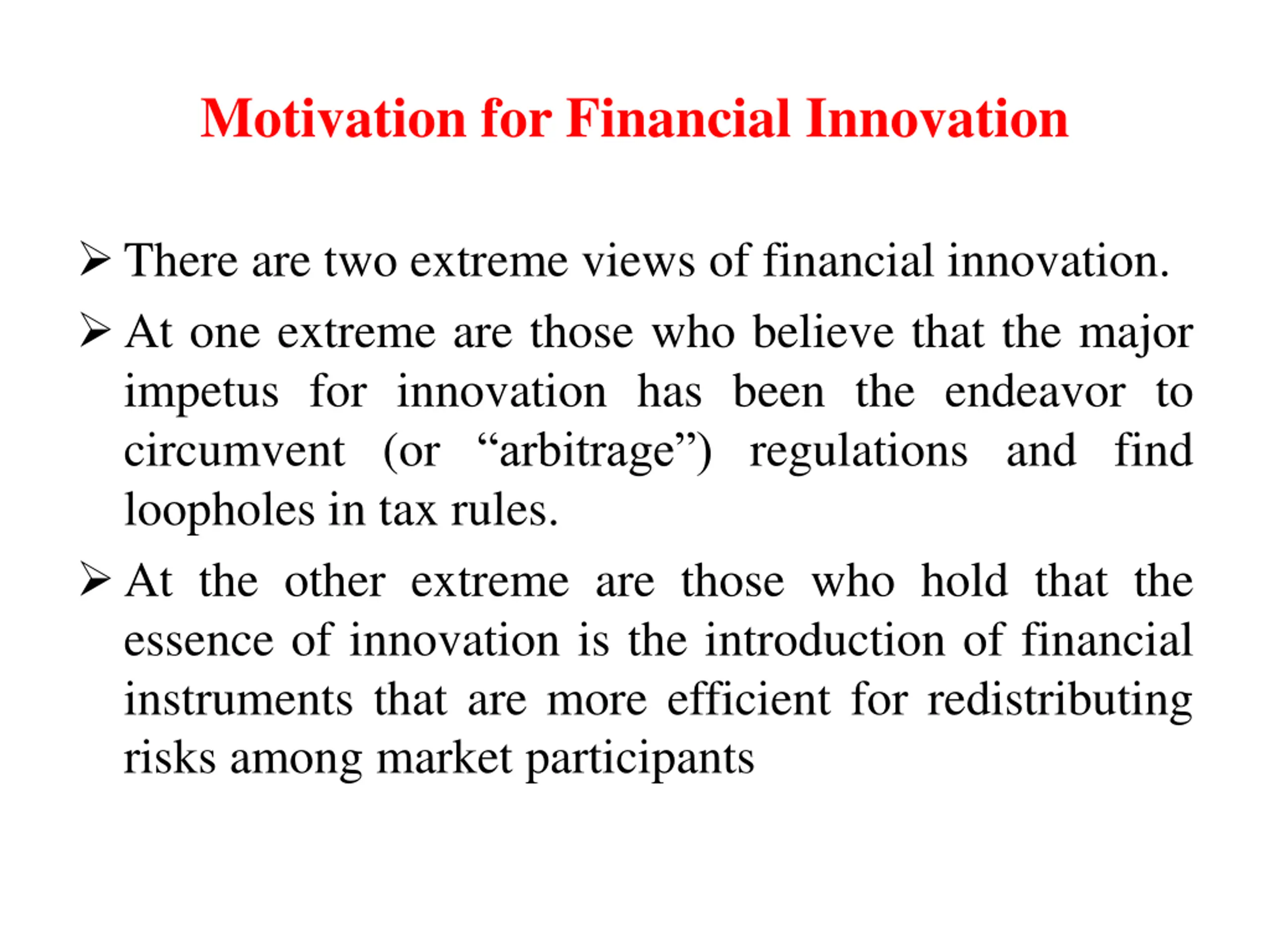 Motivation for Financial Innovation There are two extreme views of financial innovation. At one extreme are those who believe that the major impetus for innovation has been the endeavor to circumvent (or arbitrage ) regulations and find loopholes in tax rules. At the other extreme are those who hold that the essence of innovation is the introduction of financial instruments that are more efficient for redistributing risks among market participants