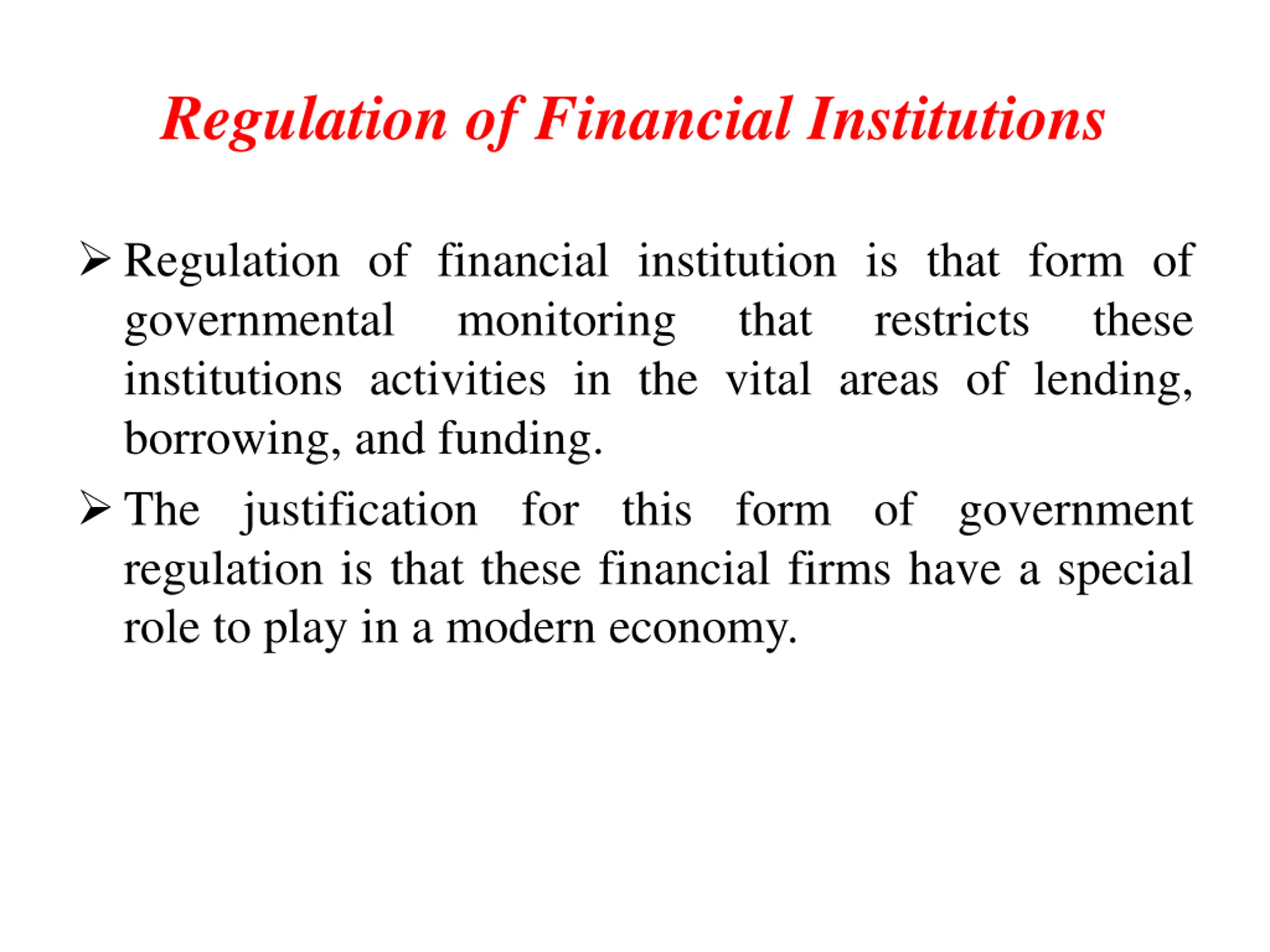 Regulation of Financial Institutions Regulation of financial institution is that form of governmental monitoring institutions activities in the vital areas of lending, borrowing, and funding. The justification for this form of government regulation is that these financial firms have a special role to play in a modern economy. that restricts these