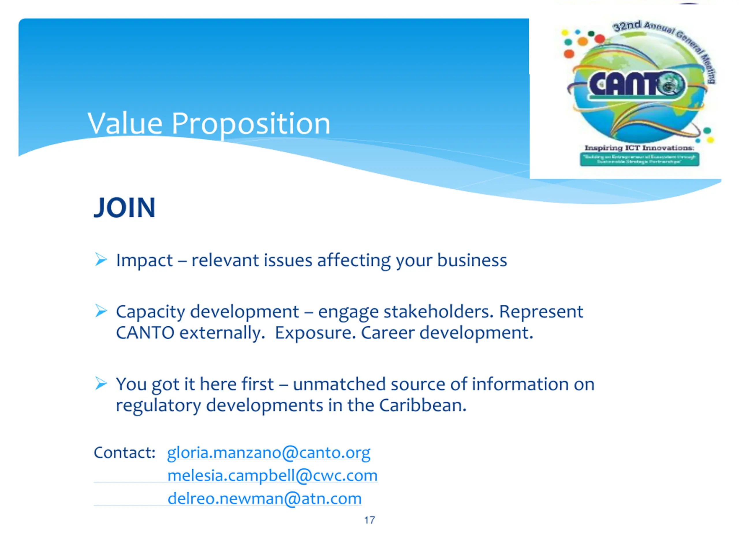 Value Proposition JOIN Impact relevant issues affecting your business Capacity development engage stakeholders. Represent CANTO externally. Exposure. Career development. You got it here first unmatched source of information on regulatory developments in the Caribbean. Contact: gloria.manzano@canto.org melesia.campbell@cwc.com delreo.newman@atn.com 17
