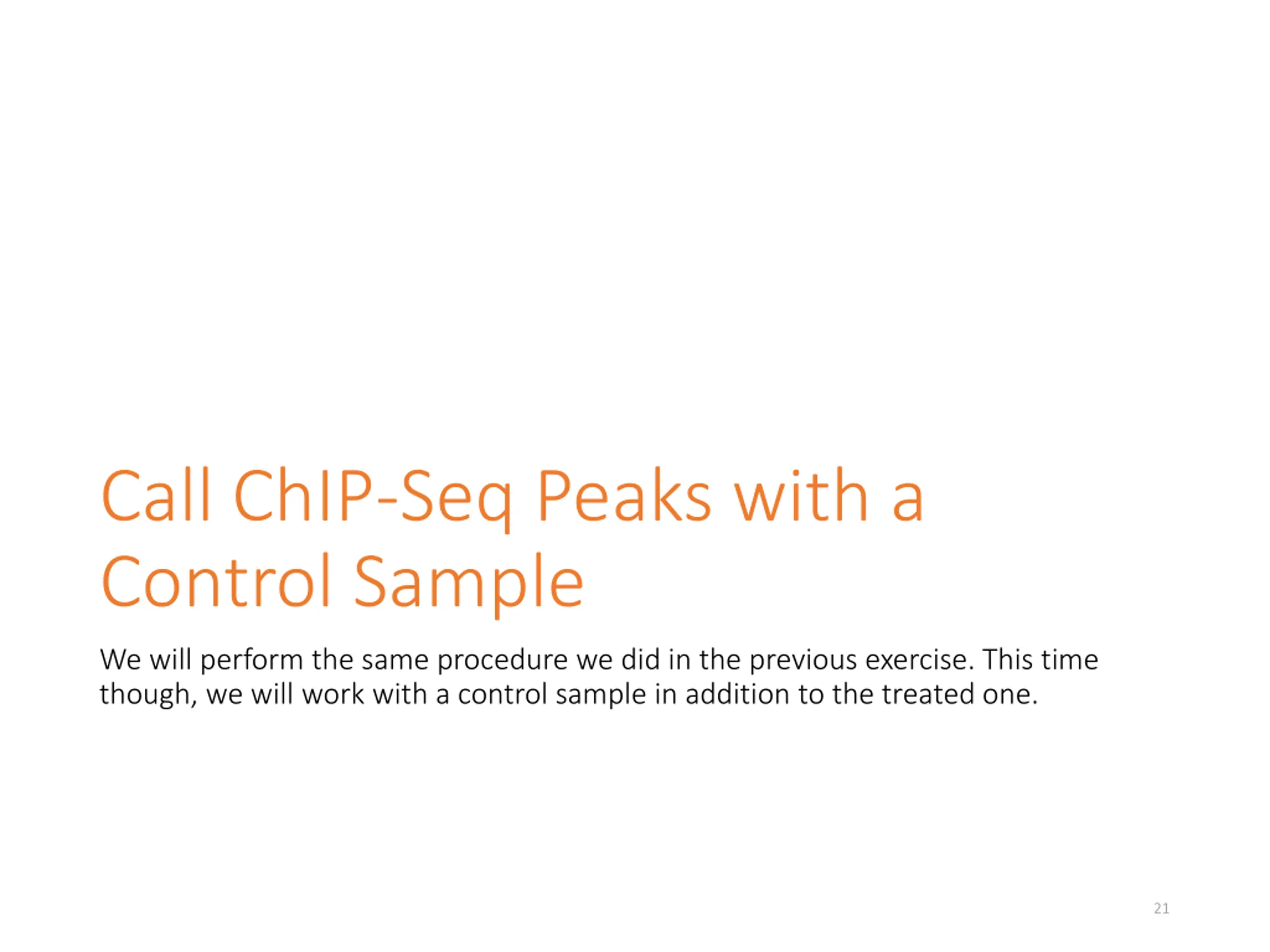 Call ChIP-Seq Peaks with a Control Sample We will perform the same procedure we did in the previous exercise. This time though, we will work with a control sample in addition to the treated one. 21