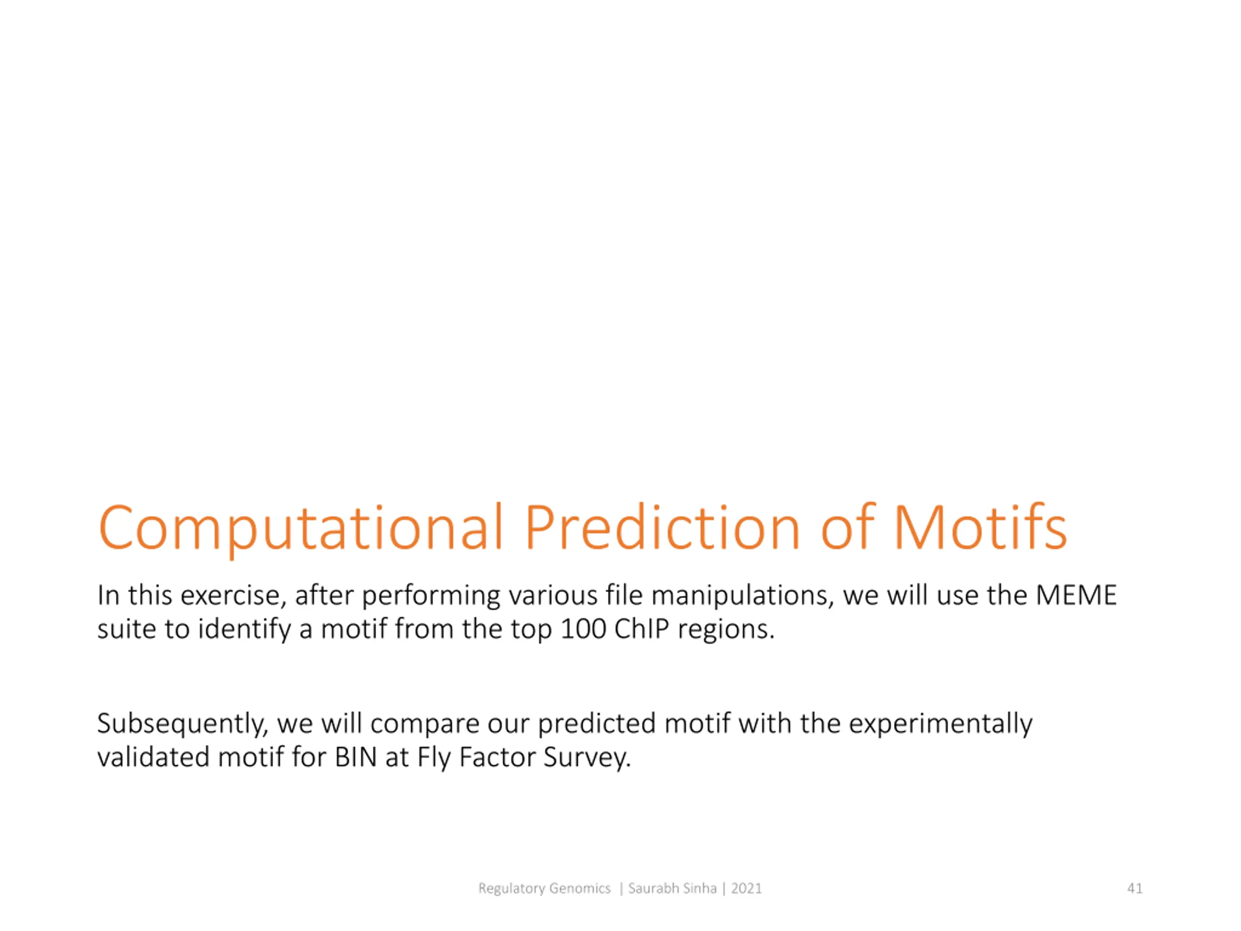 Computational Prediction of Motifs In this exercise, after performing various file manipulations, we will use the MEME suite to identify a motif from the top 100 ChIP regions. Subsequently, we will compare our predicted motif with the experimentally validated motif for BIN at Fly Factor Survey. Regulatory Genomics | Saurabh Sinha | 2021 41