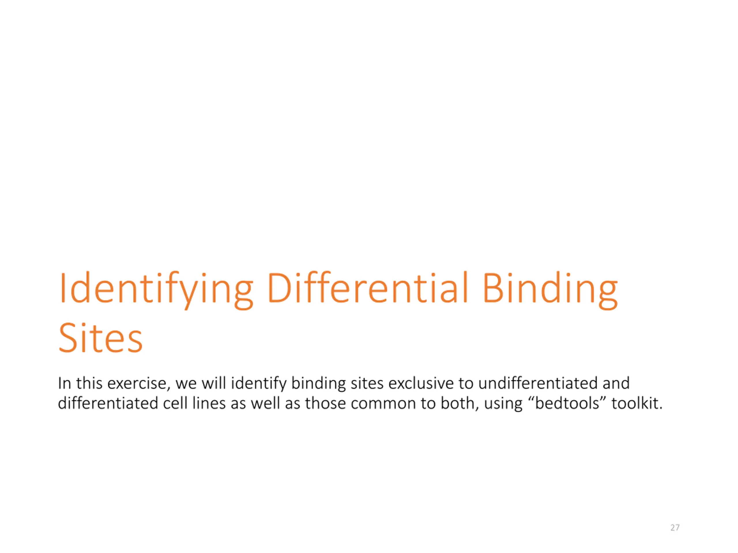 Identifying Differential Binding Sites In this exercise, we will identify binding sites exclusive to undifferentiated and differentiated cell lines as well as those common to both, using bedtools toolkit. 27