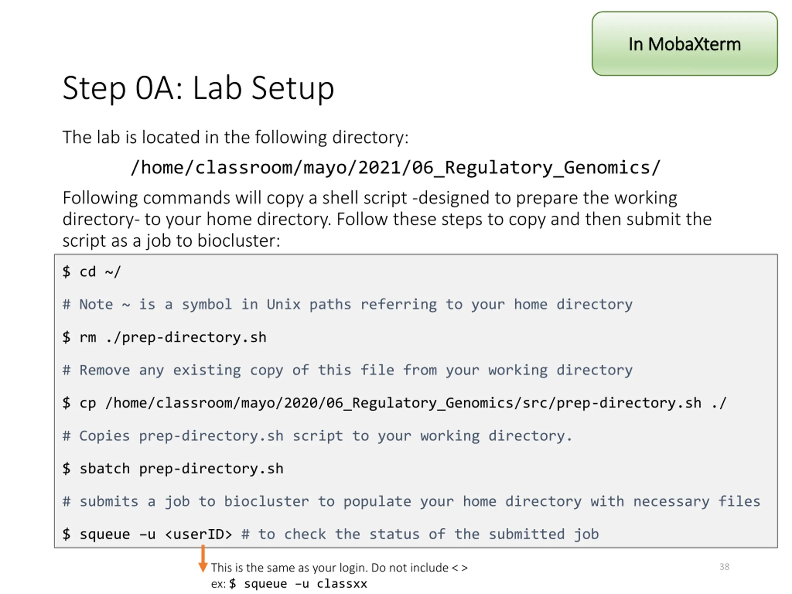 In In MobaXterm MobaXterm Step 0A: Lab Setup The lab is located in the following directory: /home/classroom/mayo/2021/06_Regulatory_Genomics/ Following commands will copy a shell script -designed to prepare the working directory- to your home directory. Follow these steps to copy and then submit the script as a job to biocluster: $ cd ~/ # Note ~ is a symbol in Unix paths referring to your home directory $ rm ./prep-directory.sh # Remove any existing copy of this file from your working directory $ cp /home/classroom/mayo/2020/06_Regulatory_Genomics/src/prep-directory.sh ./ # Copies prep-directory.sh script to your working directory. $ sbatch prep-directory.sh # submits a job to biocluster to populate your home directory with necessary files $ squeue u <userID> # to check the status of the submitted job This is the same as your login. Do not include < > ex: $ squeue u classxx 38