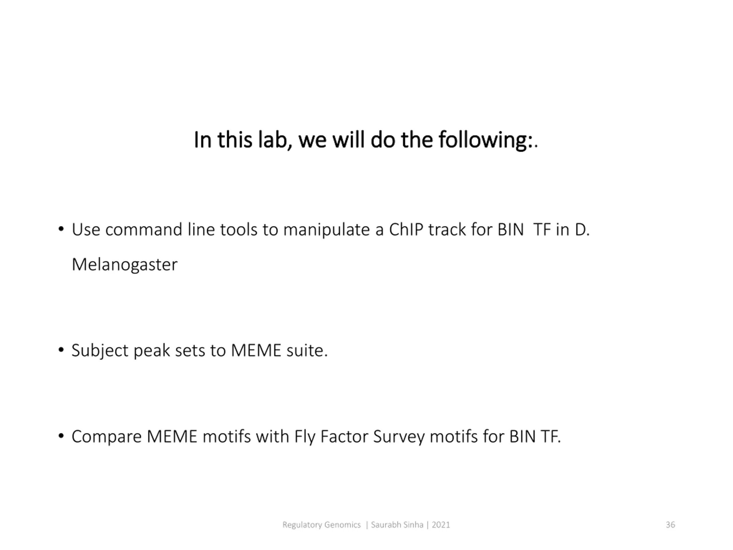 In this lab, we will do the following: In this lab, we will do the following:. Use command line tools to manipulate a ChIP track for BIN TF in D. Melanogaster Subject peak sets to MEME suite. Compare MEME motifs with Fly Factor Survey motifs for BIN TF. Regulatory Genomics | Saurabh Sinha | 2021 36
