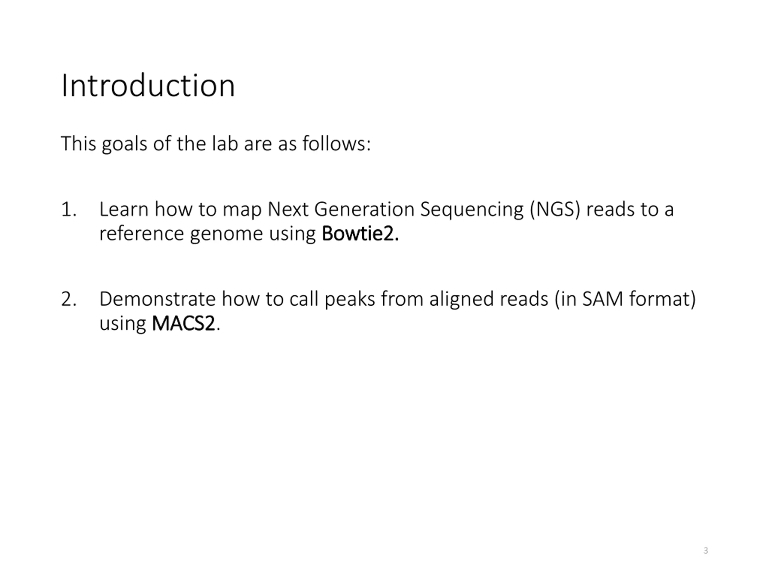 Introduction This goals of the lab are as follows: 1. Learn how to map Next Generation Sequencing (NGS) reads to a reference genome using Bowtie2. Bowtie2. 2. Demonstrate how to call peaks from aligned reads (in SAM format) using MACS2 MACS2. 3