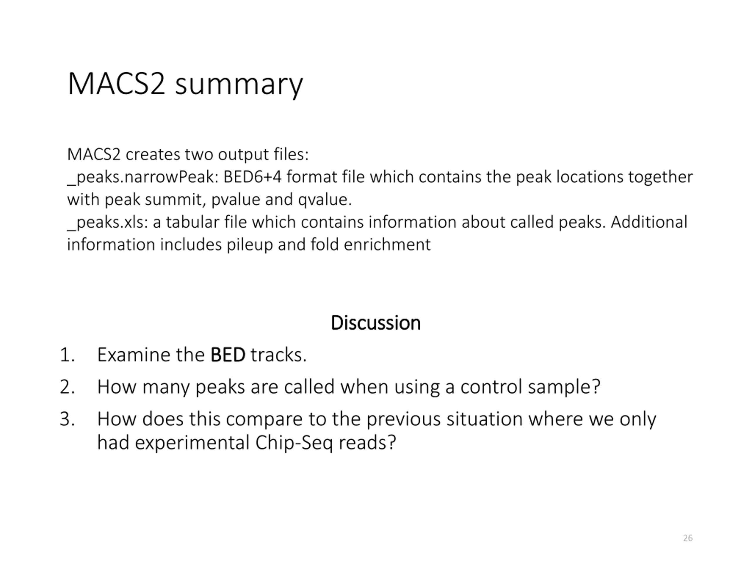 MACS2 summary MACS2 creates two output files: _peaks.narrowPeak: BED6+4 format file which contains the peak locations together with peak summit, pvalue and qvalue. _peaks.xls: a tabular file which contains information about called peaks. Additional information includes pileup and fold enrichment Discussion Discussion 1. 2. 3. Examine the BED How many peaks are called when using a control sample? How does this compare to the previous situation where we only had experimental Chip-Seq reads? BED tracks. 26