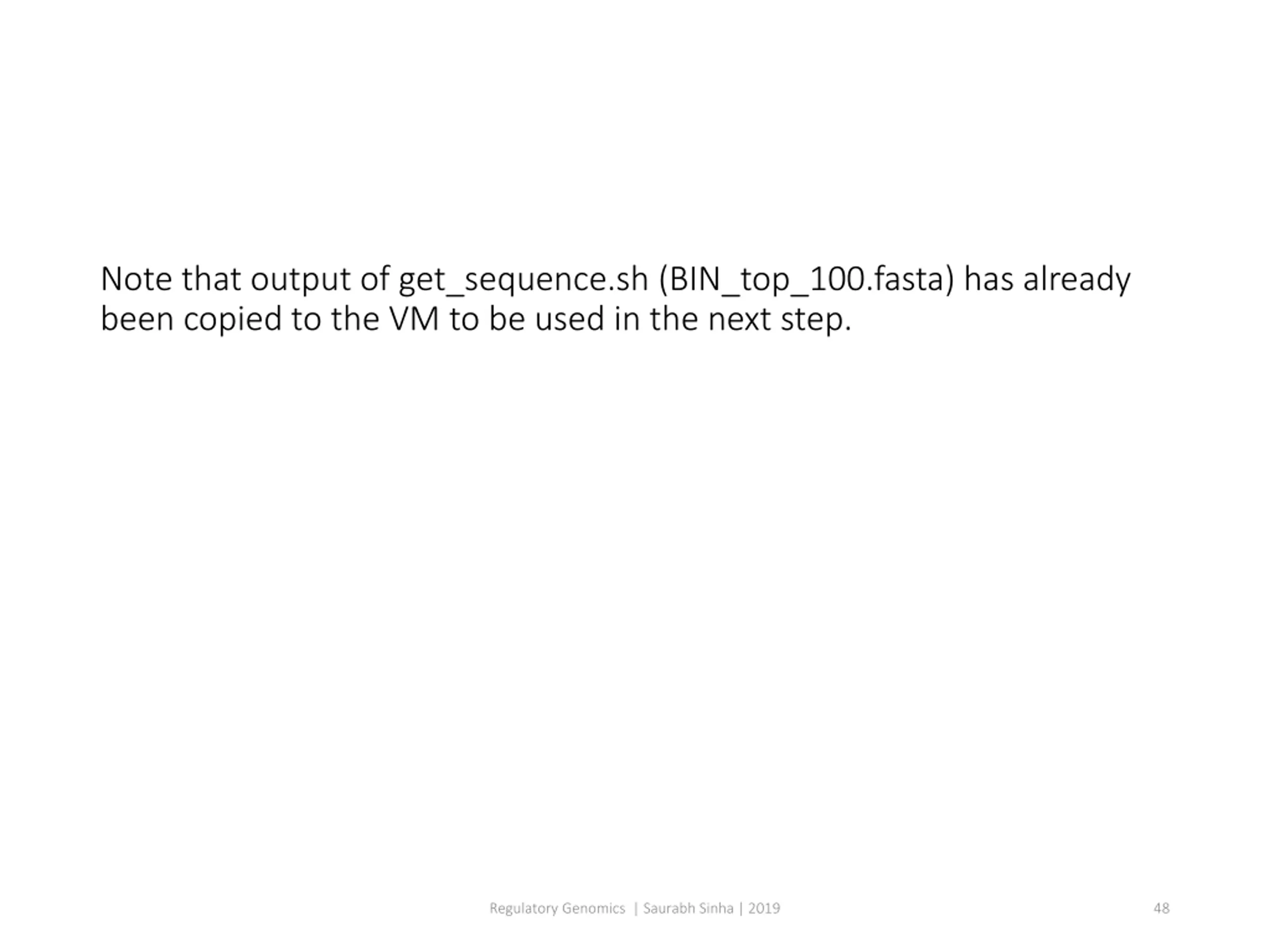 Note that output of get_sequence.sh (BIN_top_100.fasta) has already been copied to the VM to be used in the next step. Regulatory Genomics | Saurabh Sinha | 2019 48