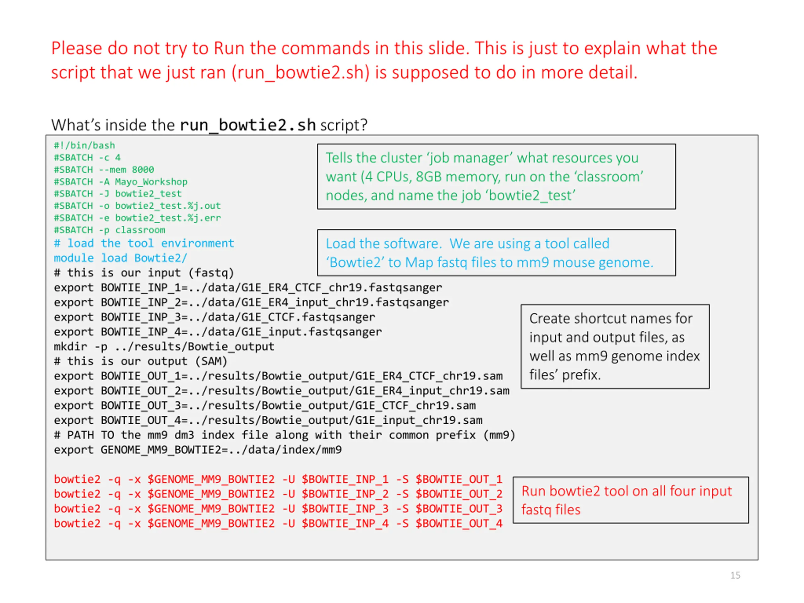 Please do not try to Run the commands in this slide. This is just to explain what the script that we just ran (run_bowtie2.sh) is supposed to do in more detail. What s inside the run_bowtie2.sh script? #!/bin/bash #SBATCH -c 4 #SBATCH --mem 8000 #SBATCH -A Mayo_Workshop #SBATCH -J bowtie2_test #SBATCH -o bowtie2_test.%j.out #SBATCH -e bowtie2_test.%j.err #SBATCH -p classroom # load the tool environment module load Bowtie2/ # this is our input (fastq) export BOWTIE_INP_1=../data/G1E_ER4_CTCF_chr19.fastqsanger export BOWTIE_INP_2=../data/G1E_ER4_input_chr19.fastqsanger export BOWTIE_INP_3=../data/G1E_CTCF.fastqsanger export BOWTIE_INP_4=../data/G1E_input.fastqsanger mkdir -p ../results/Bowtie_output # this is our output (SAM) export BOWTIE_OUT_1=../results/Bowtie_output/G1E_ER4_CTCF_chr19.sam export BOWTIE_OUT_2=../results/Bowtie_output/G1E_ER4_input_chr19.sam export BOWTIE_OUT_3=../results/Bowtie_output/G1E_CTCF_chr19.sam export BOWTIE_OUT_4=../results/Bowtie_output/G1E_input_chr19.sam # PATH TO the mm9 dm3 index file along with their common prefix (mm9) export GENOME_MM9_BOWTIE2=../data/index/mm9 Tells the cluster job manager what resources you want (4 CPUs, 8GB memory, run on the classroom nodes, and name the job bowtie2_test Load the software. We are using a tool called Bowtie2 to Map fastq files to mm9 mouse genome. Create shortcut names for input and output files, as well as mm9 genome index files prefix. bowtie2 -q -x $GENOME_MM9_BOWTIE2 -U $BOWTIE_INP_1 -S $BOWTIE_OUT_1 bowtie2 -q -x $GENOME_MM9_BOWTIE2 -U $BOWTIE_INP_2 -S $BOWTIE_OUT_2 bowtie2 -q -x $GENOME_MM9_BOWTIE2 -U $BOWTIE_INP_3 -S $BOWTIE_OUT_3 bowtie2 -q -x $GENOME_MM9_BOWTIE2 -U $BOWTIE_INP_4 -S $BOWTIE_OUT_4 Run bowtie2 tool on all four input fastq files 15