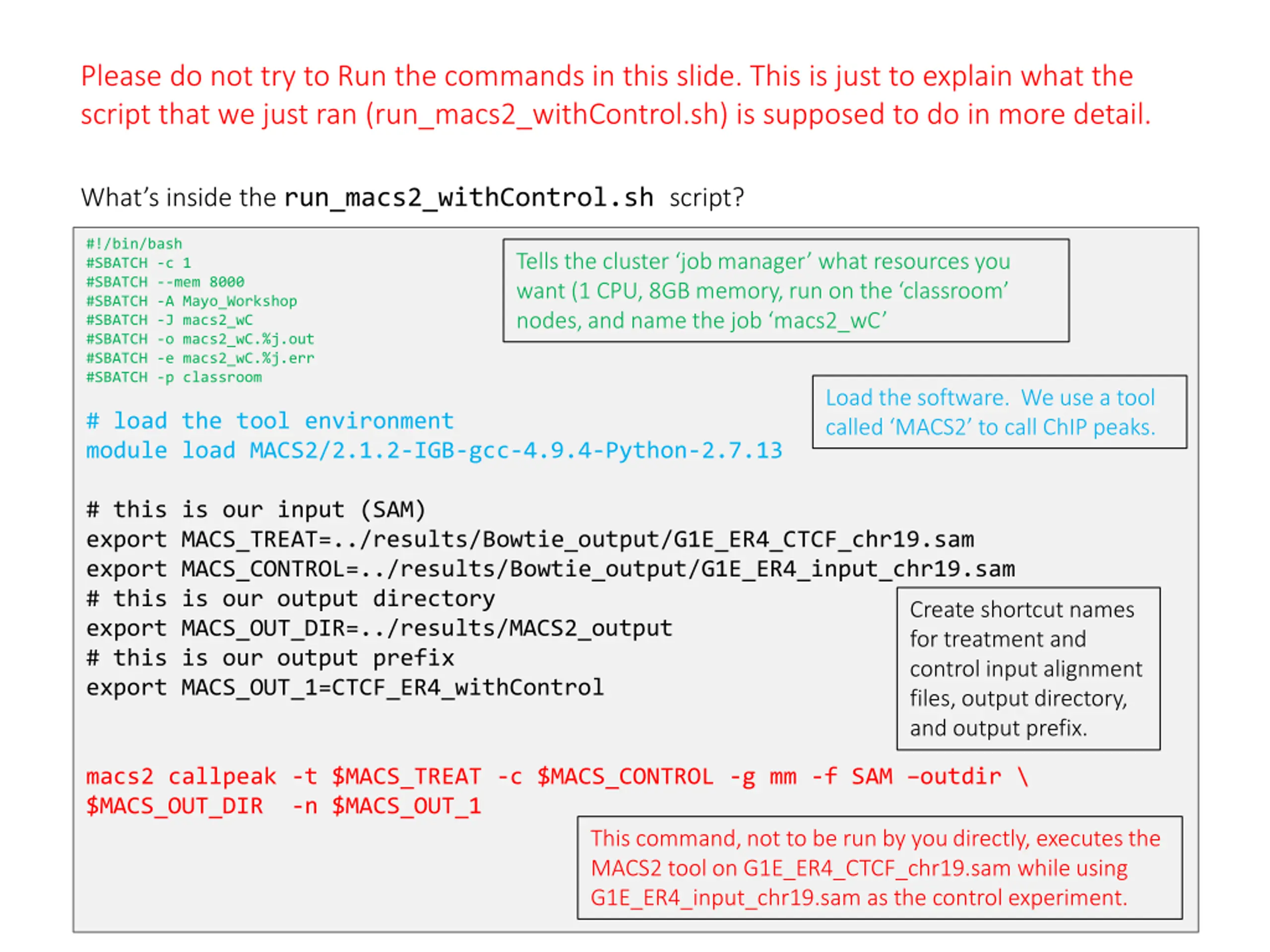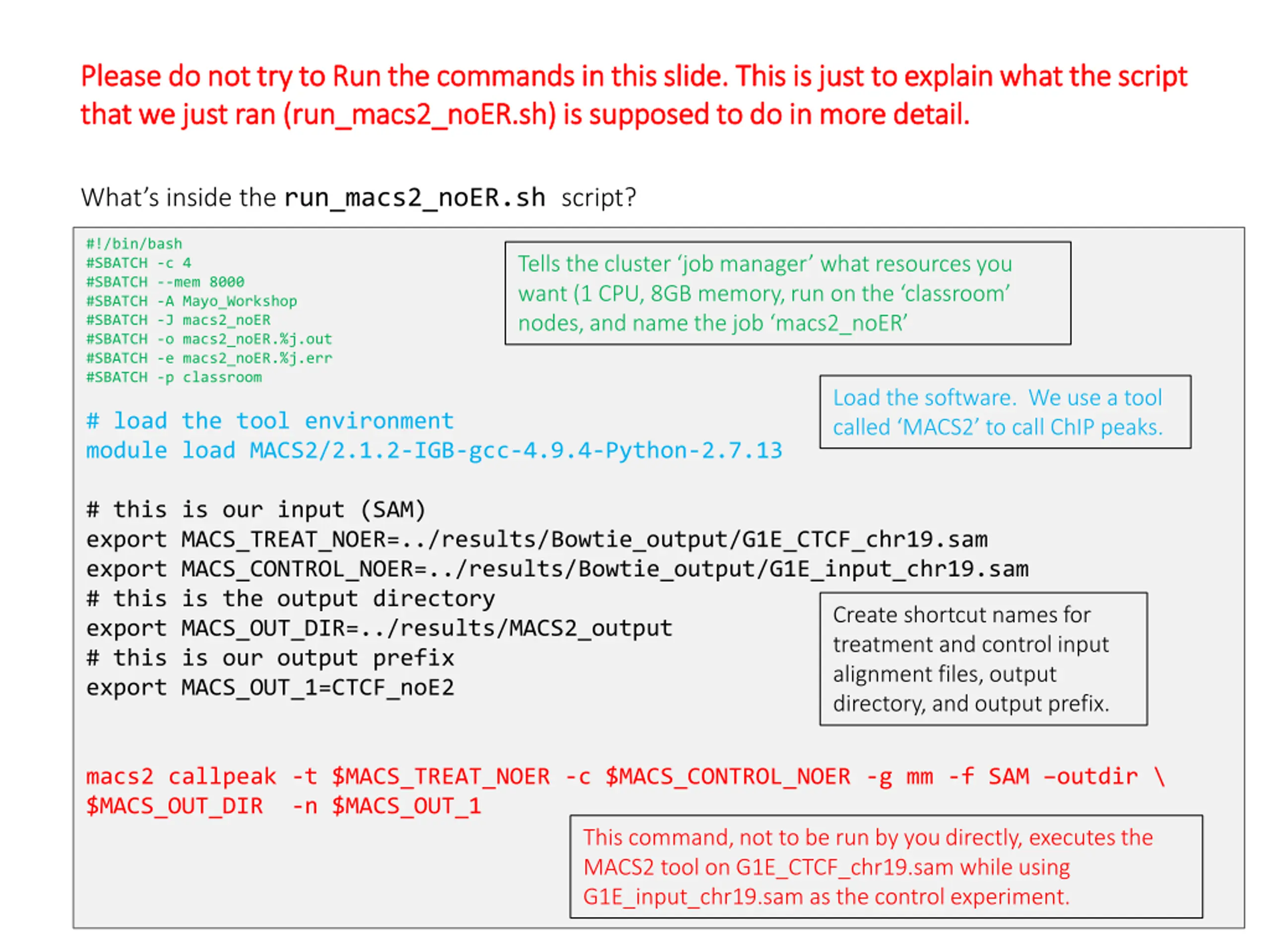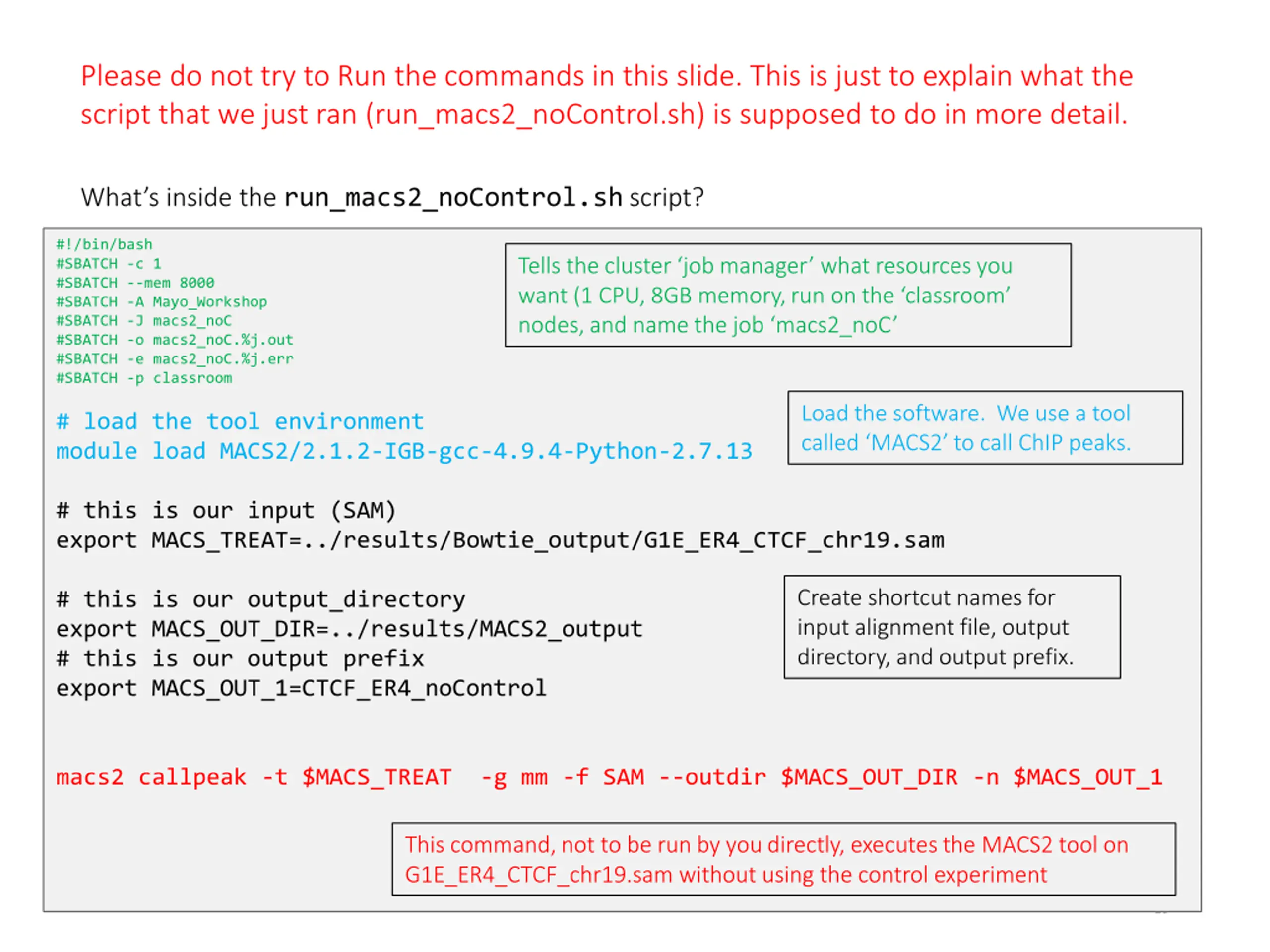 Please do not try to Run the commands in this slide. This is just to explain what the script that we just ran (run_macs2_noControl.sh) is supposed to do in more detail. What s inside the run_macs2_noControl.sh script? #!/bin/bash #SBATCH -c 1 #SBATCH --mem 8000 #SBATCH -A Mayo_Workshop #SBATCH -J macs2_noC #SBATCH -o macs2_noC.%j.out #SBATCH -e macs2_noC.%j.err #SBATCH -p classroom Tells the cluster job manager what resources you want (1 CPU, 8GB memory, run on the classroom nodes, and name the job macs2_noC Load the software. We use a tool called MACS2 to call ChIP peaks. # load the tool environment module load MACS2/2.1.2-IGB-gcc-4.9.4-Python-2.7.13 # this is our input (SAM) export MACS_TREAT=../results/Bowtie_output/G1E_ER4_CTCF_chr19.sam Create shortcut names for input alignment file, output directory, and output prefix. # this is our output_directory export MACS_OUT_DIR=../results/MACS2_output # this is our output prefix export MACS_OUT_1=CTCF_ER4_noControl macs2 callpeak -t $MACS_TREAT -g mm -f SAM --outdir $MACS_OUT_DIR -n $MACS_OUT_1 This command, not to be run by you directly, executes the MACS2 tool on G1E_ER4_CTCF_chr19.sam without using the control experiment 19