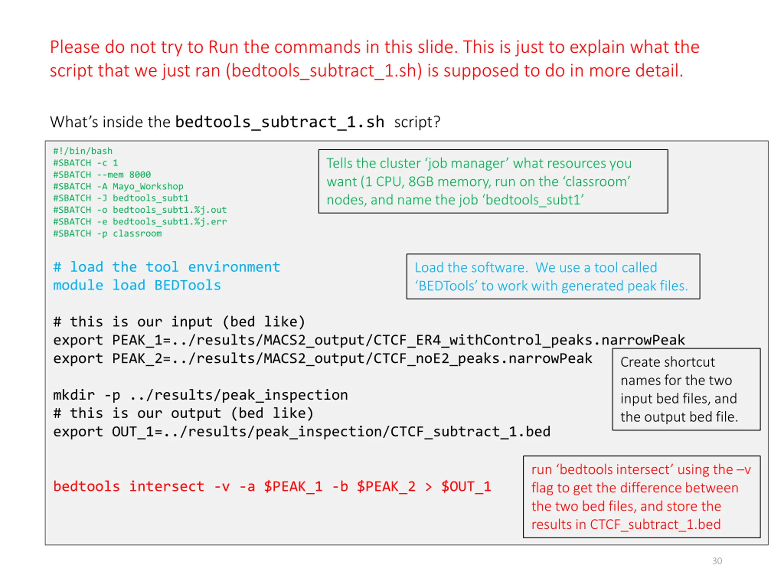 Please do not try to Run the commands in this slide. This is just to explain what the script that we just ran (bedtools_subtract_1.sh) is supposed to do in more detail. What s inside the bedtools_subtract_1.sh script? #!/bin/bash #SBATCH -c 1 #SBATCH --mem 8000 #SBATCH -A Mayo_Workshop #SBATCH -J bedtools_subt1 #SBATCH -o bedtools_subt1.%j.out #SBATCH -e bedtools_subt1.%j.err #SBATCH -p classroom Tells the cluster job manager what resources you want (1 CPU, 8GB memory, run on the classroom nodes, and name the job bedtools_subt1 # load the tool environment module load BEDTools Load the software. We use a tool called BEDTools to work with generated peak files. # this is our input (bed like) export PEAK_1=../results/MACS2_output/CTCF_ER4_withControl_peaks.narrowPeak export PEAK_2=../results/MACS2_output/CTCF_noE2_peaks.narrowPeak Create shortcut names for the two input bed files, and the output bed file. mkdir -p ../results/peak_inspection # this is our output (bed like) export OUT_1=../results/peak_inspection/CTCF_subtract_1.bed run bedtools intersect using the v flag to get the difference between the two bed files, and store the results in CTCF_subtract_1.bed bedtools intersect -v -a $PEAK_1 -b $PEAK_2 > $OUT_1 30