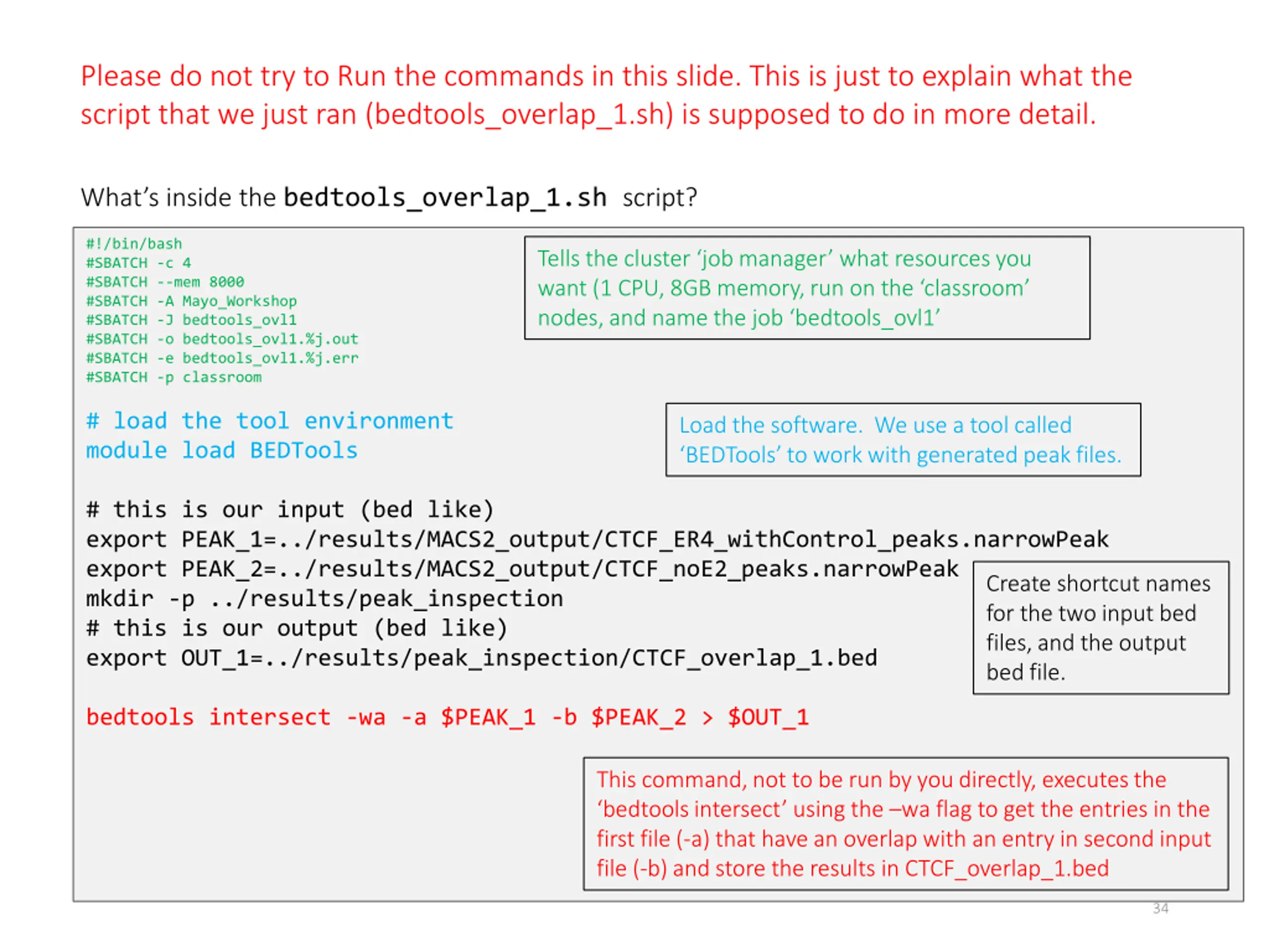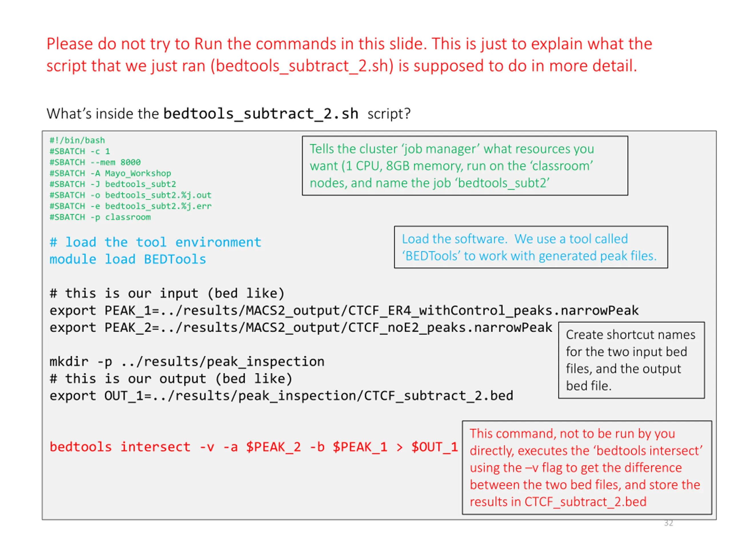 Please do not try to Run the commands in this slide. This is just to explain what the script that we just ran (bedtools_subtract_2.sh) is supposed to do in more detail. What s inside the bedtools_subtract_2.sh script? #!/bin/bash #SBATCH -c 1 #SBATCH --mem 8000 #SBATCH -A Mayo_Workshop #SBATCH -J bedtools_subt2 #SBATCH -o bedtools_subt2.%j.out #SBATCH -e bedtools_subt2.%j.err #SBATCH -p classroom Tells the cluster job manager what resources you want (1 CPU, 8GB memory, run on the classroom nodes, and name the job bedtools_subt2 Load the software. We use a tool called BEDTools to work with generated peak files. # load the tool environment module load BEDTools # this is our input (bed like) export PEAK_1=../results/MACS2_output/CTCF_ER4_withControl_peaks.narrowPeak export PEAK_2=../results/MACS2_output/CTCF_noE2_peaks.narrowPeak Create shortcut names for the two input bed files, and the output bed file. mkdir -p ../results/peak_inspection # this is our output (bed like) export OUT_1=../results/peak_inspection/CTCF_subtract_2.bed This command, not to be run by you directly, executes the bedtools intersect using the v flag to get the difference between the two bed files, and store the results in CTCF_subtract_2.bed bedtools intersect -v -a $PEAK_2 -b $PEAK_1 > $OUT_1 32